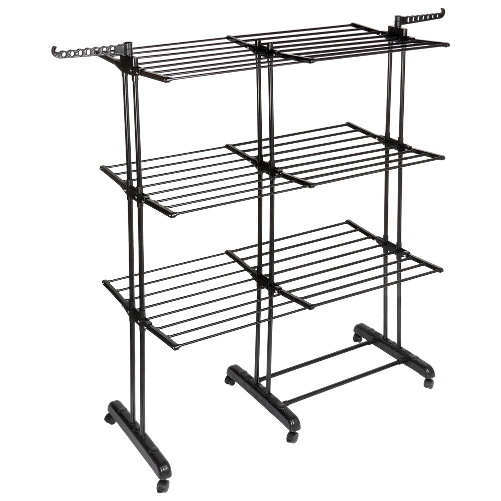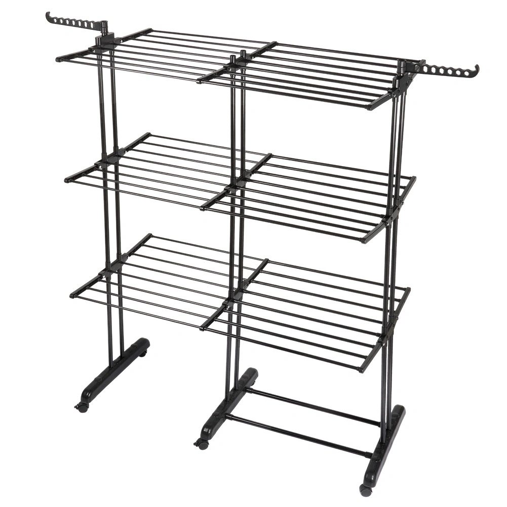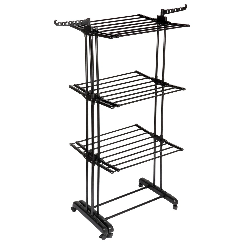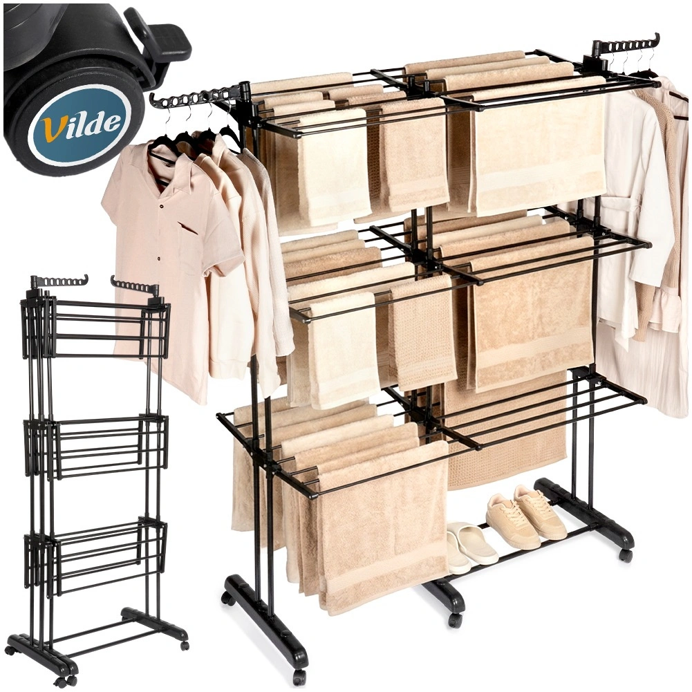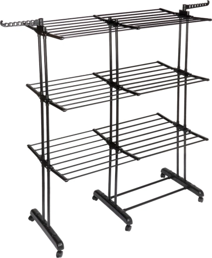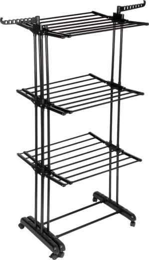 Vertikaalne XXL-kuivatusrest elegantses mustas toonis sobib suurepäraselt korterisse, pesuruumi ja rõdule. Kolm iseseisvat taset ja kuus eraldi allaklapitavat tiiba võimaldavad ruumi kohandada pesu pikkuse ja hulga järgi. Külgedel on õlgadehoidikud avadega riidepuudele, all praktiline riiul näiteks jalanõude jaoks.