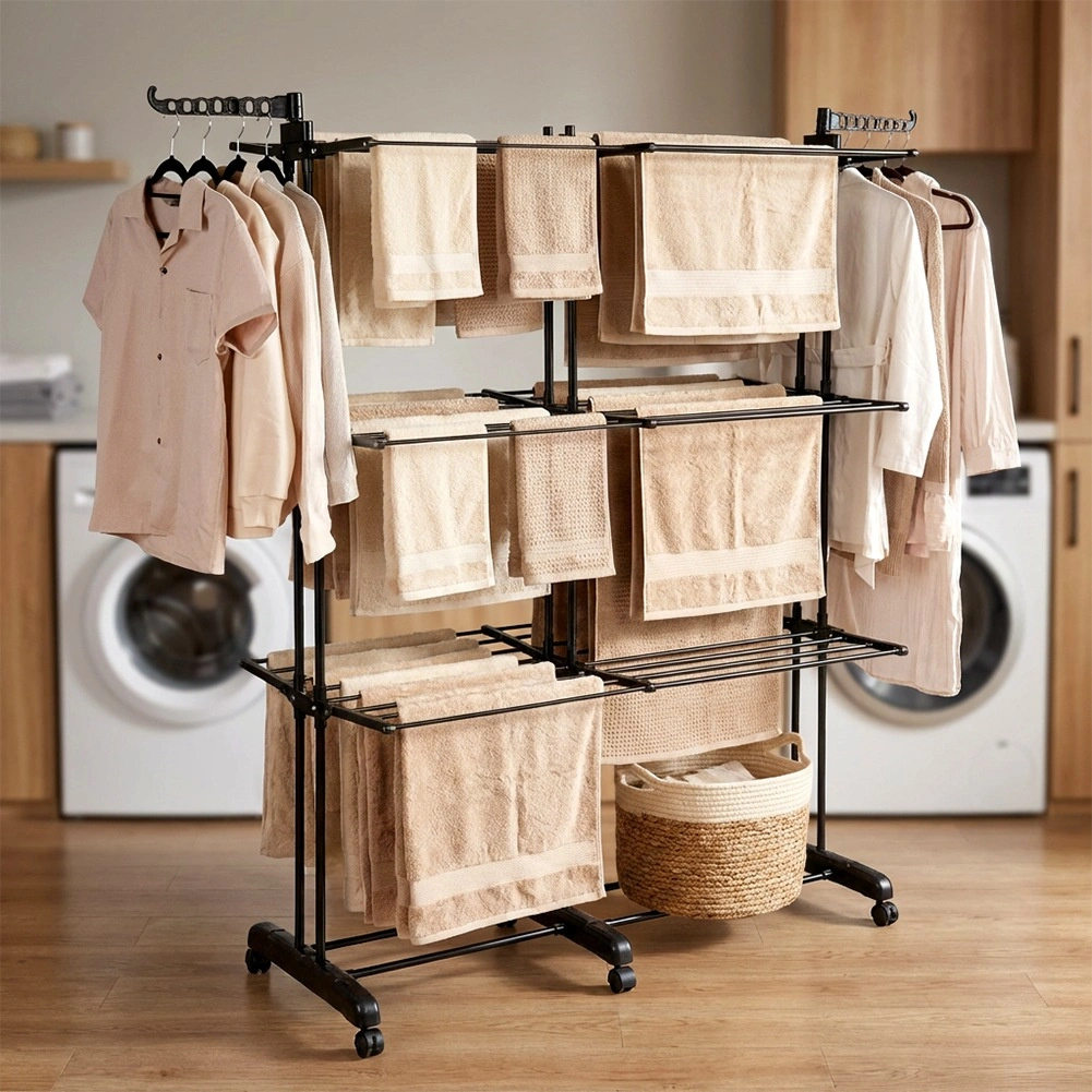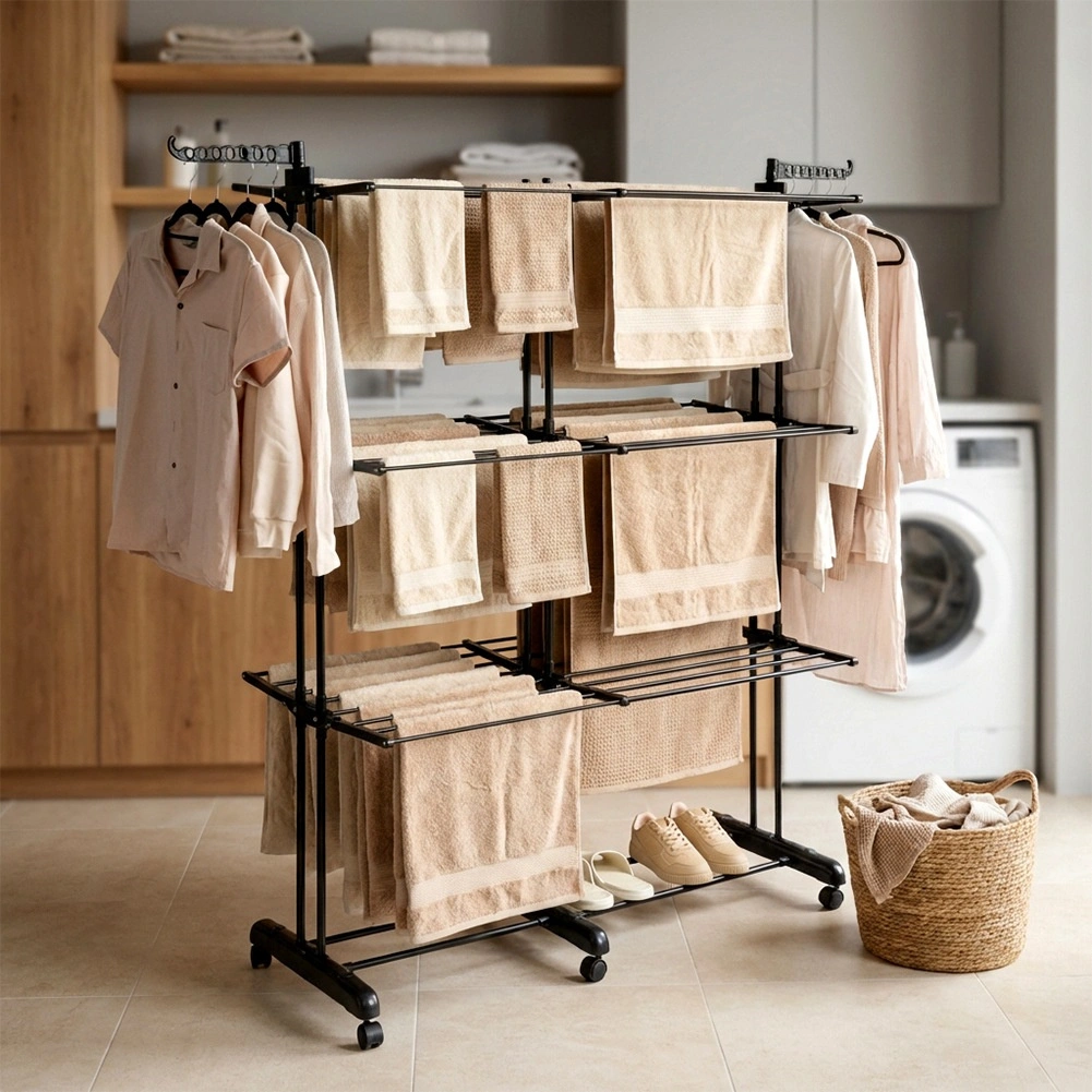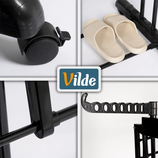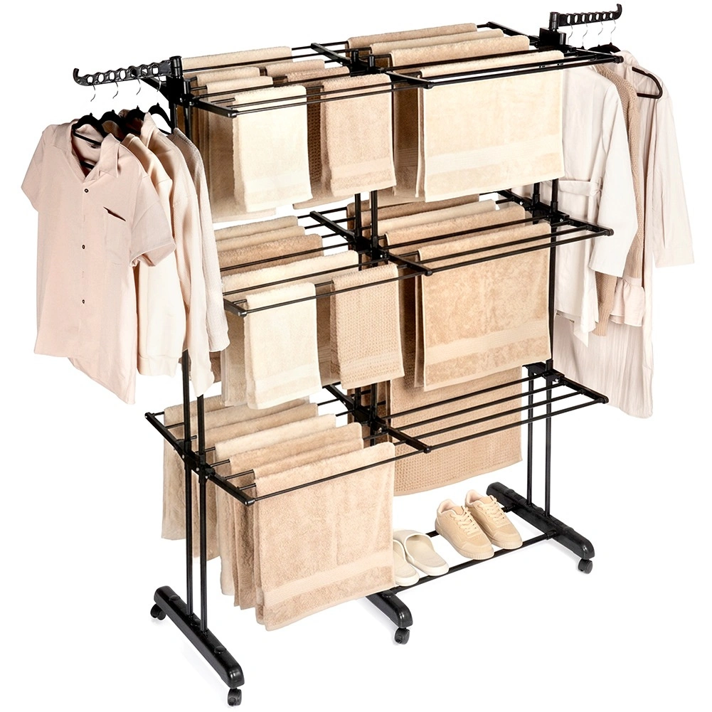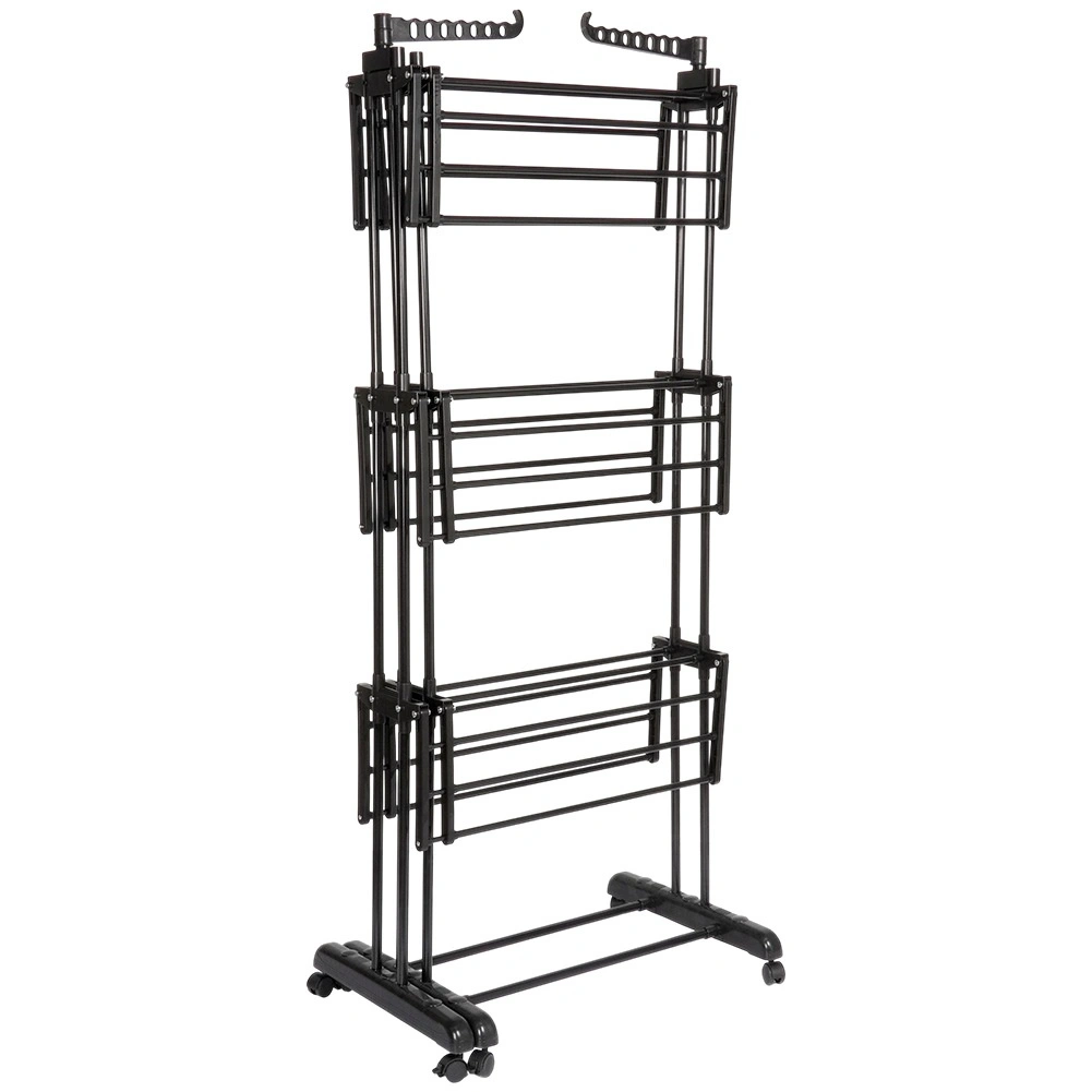 Vertikaalne XXL-kuivatusrest elegantses mustas toonis sobib suurepäraselt korterisse, pesuruumi ja rõdule. Kolm iseseisvat taset ja kuus eraldi allaklapitavat tiiba võimaldavad ruumi kohandada pesu pikkuse ja hulga järgi. Külgedel on õlgadehoidikud avadega riidepuudele, all praktiline riiul näiteks jalanõude jaoks.