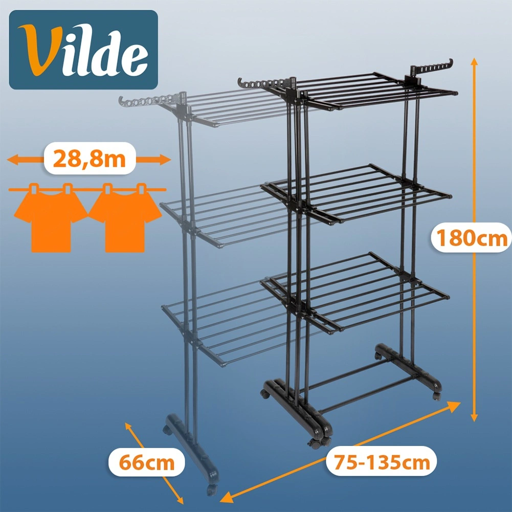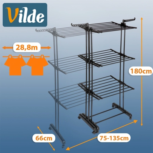 Praktiline vertikaalne pesukuivatusrest teleskooplaiusega 75–135 cm pakub 3 kuivatusastet, 47 varrast ja kuni 28,8 m kuivatuspinda. Tänu stabiilsele metallkonstruktsioonile, 6 piduriga rattale ja volditavatele õlgadehoidikutele kuivatate hõlpsalt nii suuri kui väikseid pesukoguseid ning säästate ruumi.