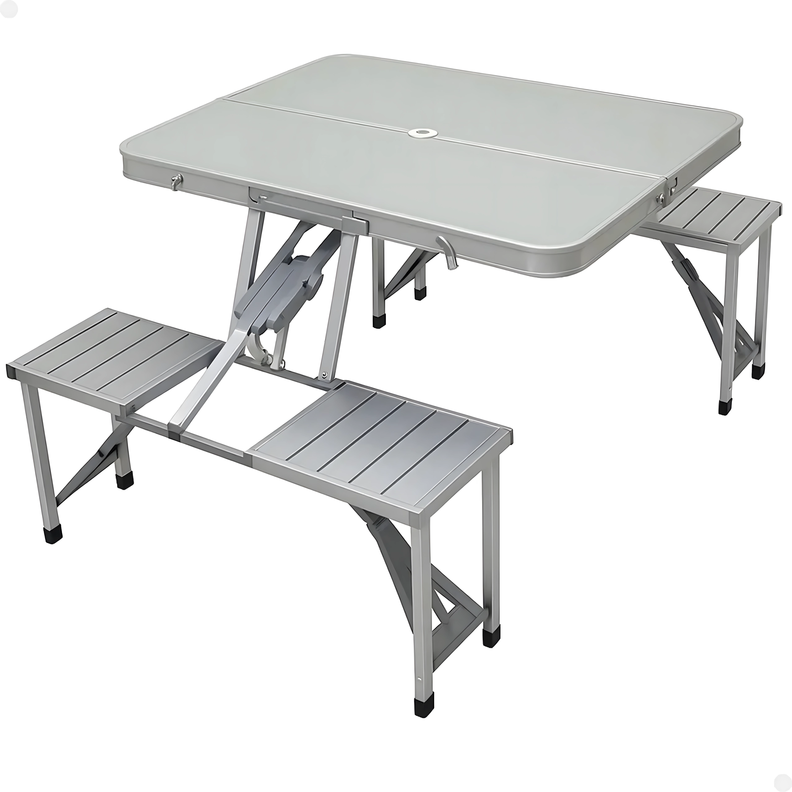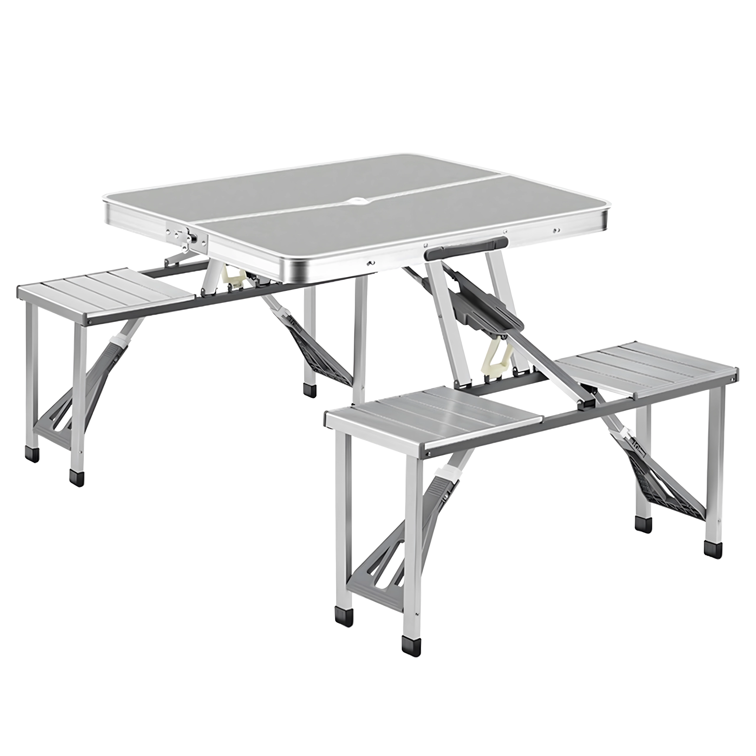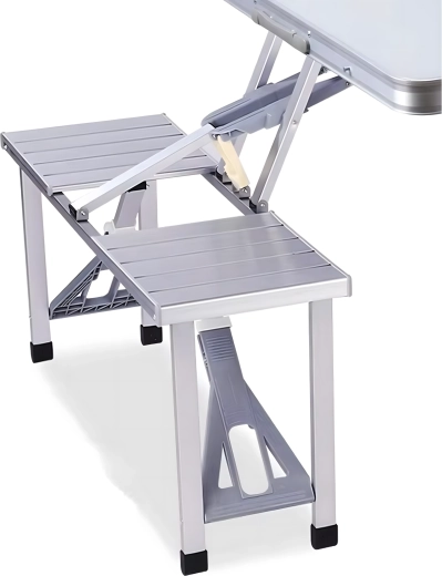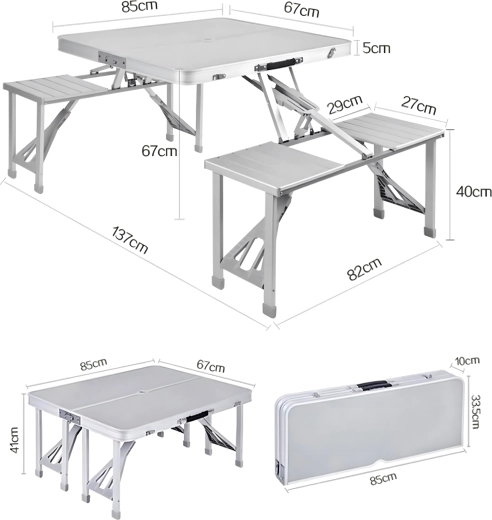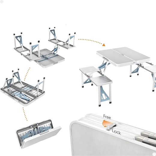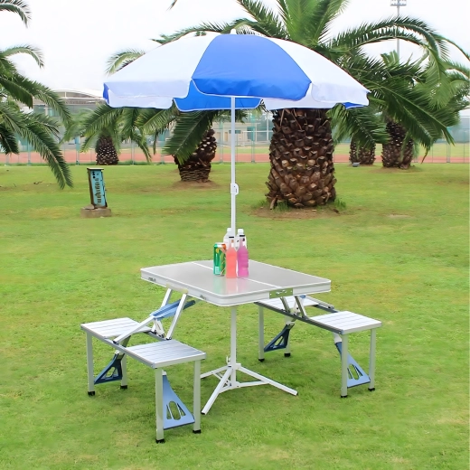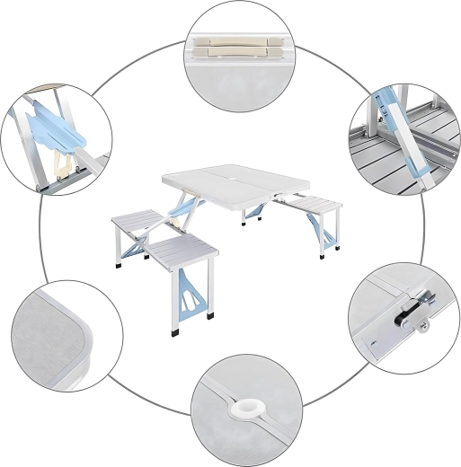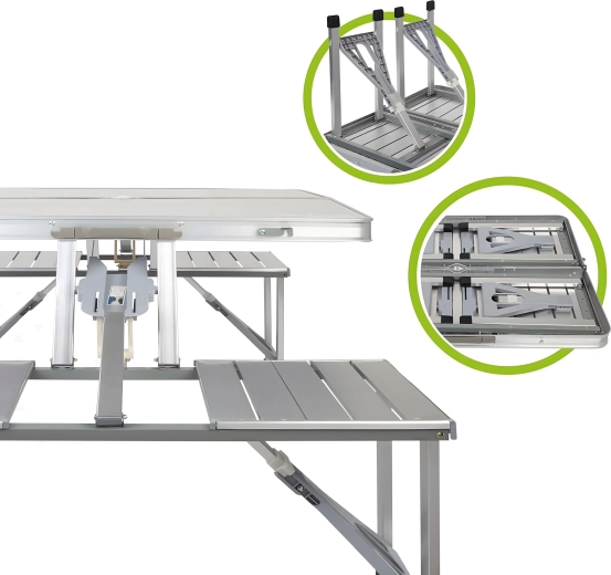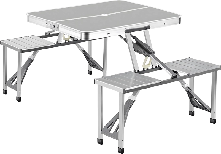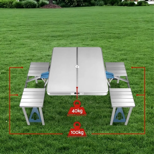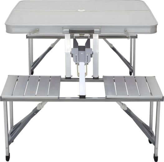 Praktiline ja kerge kokkupandav matkalaud nelja integreeritud istmega on ideaalne piknikule, matkale, randa ja aeda. Vastupidav alumiiniumi ja PVC kombinatsioon tagab pika kasutusea, kokkupanduna muutub komplekt kompaktseks sangaga kohvriks. Laual on päikesevarju ava, et nautida meeldivat varju ka palavatel päevadel.