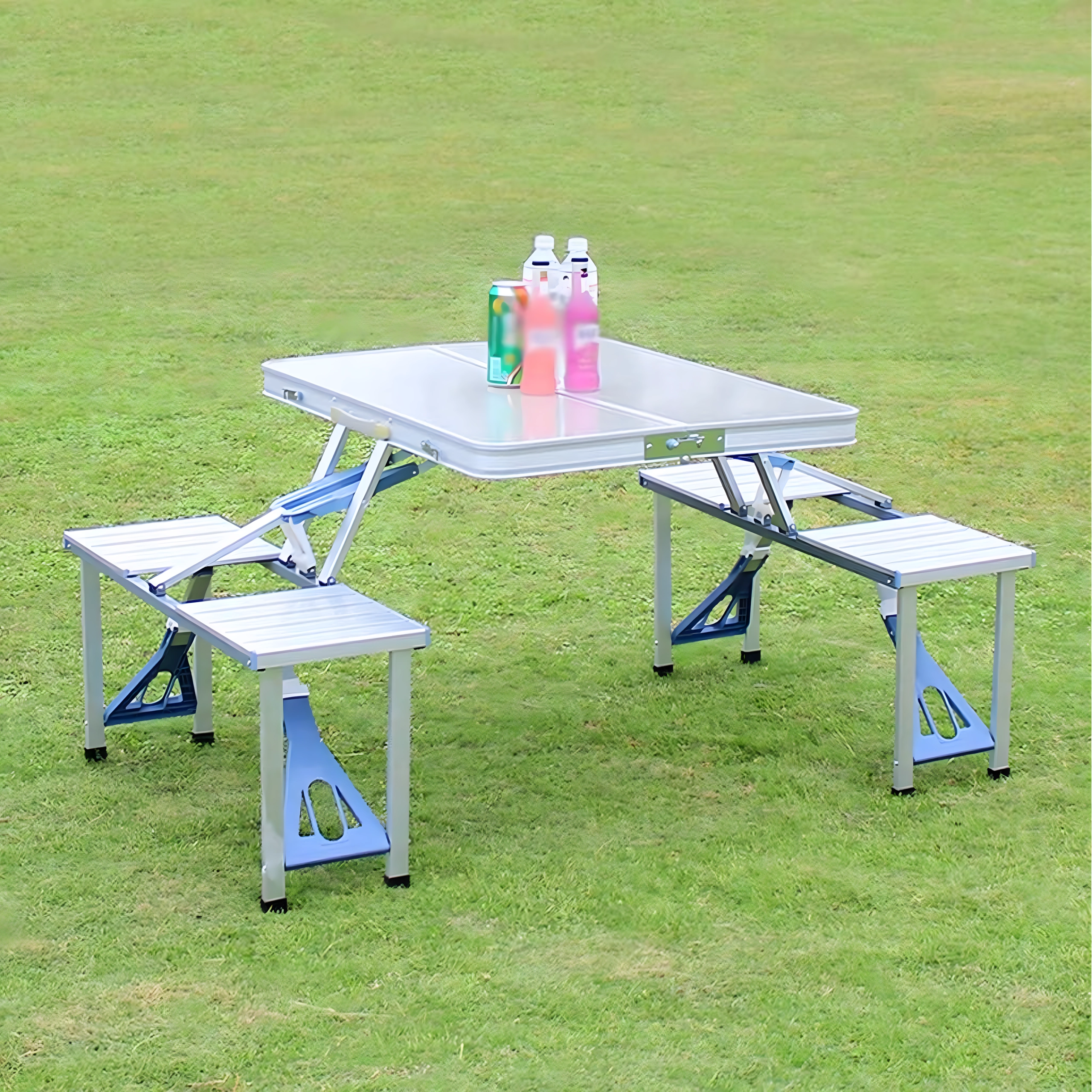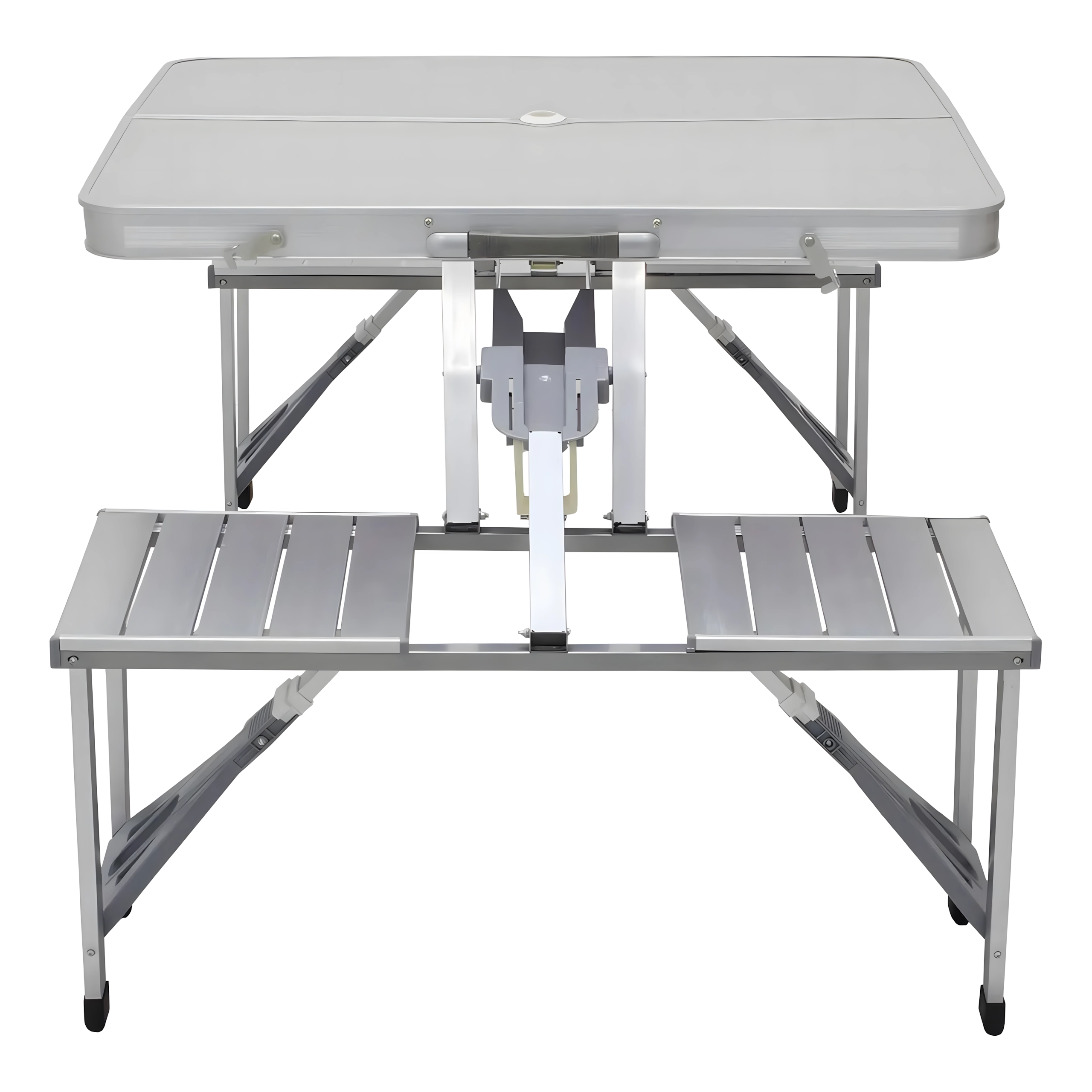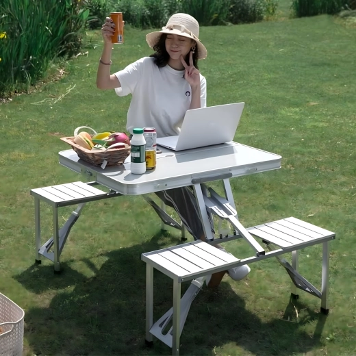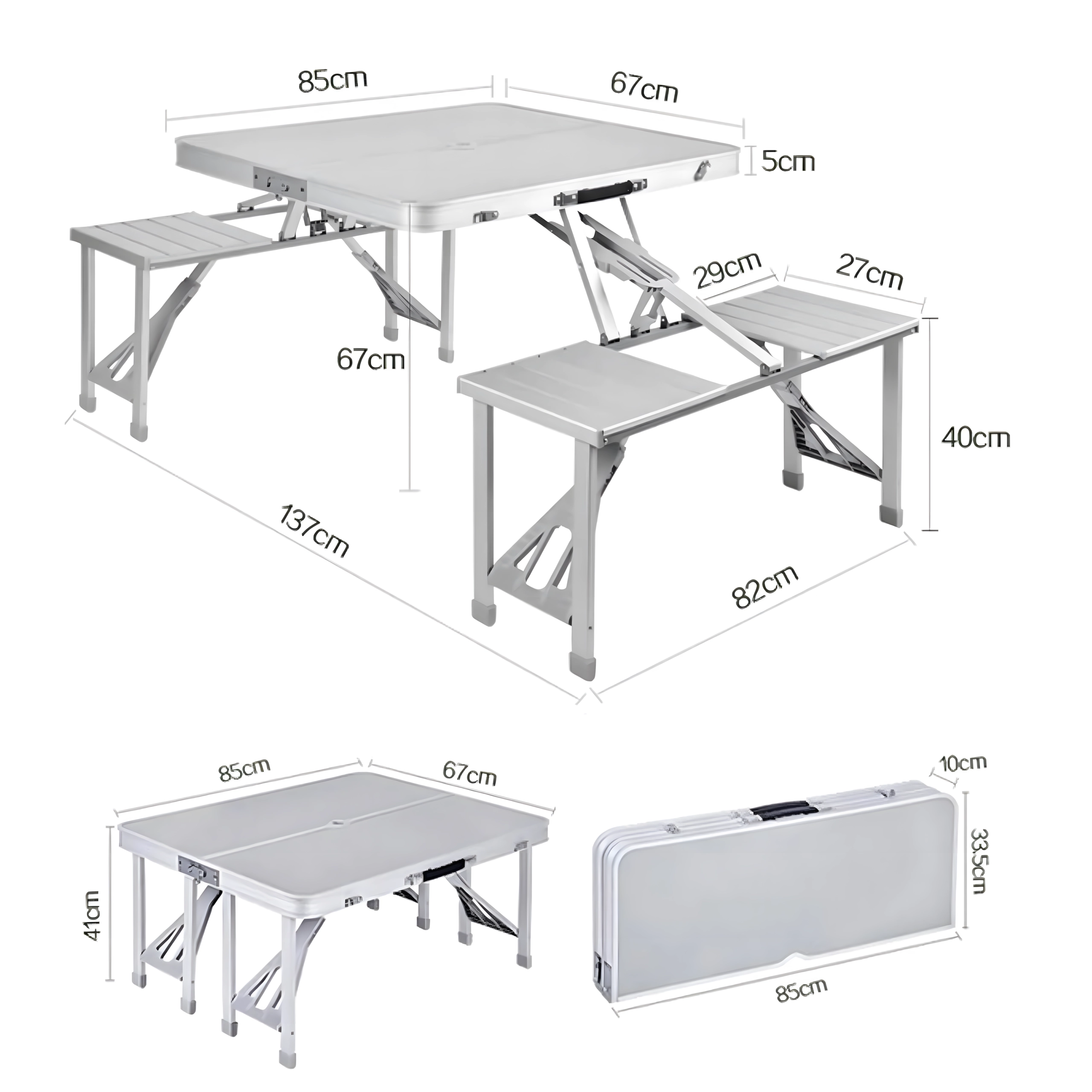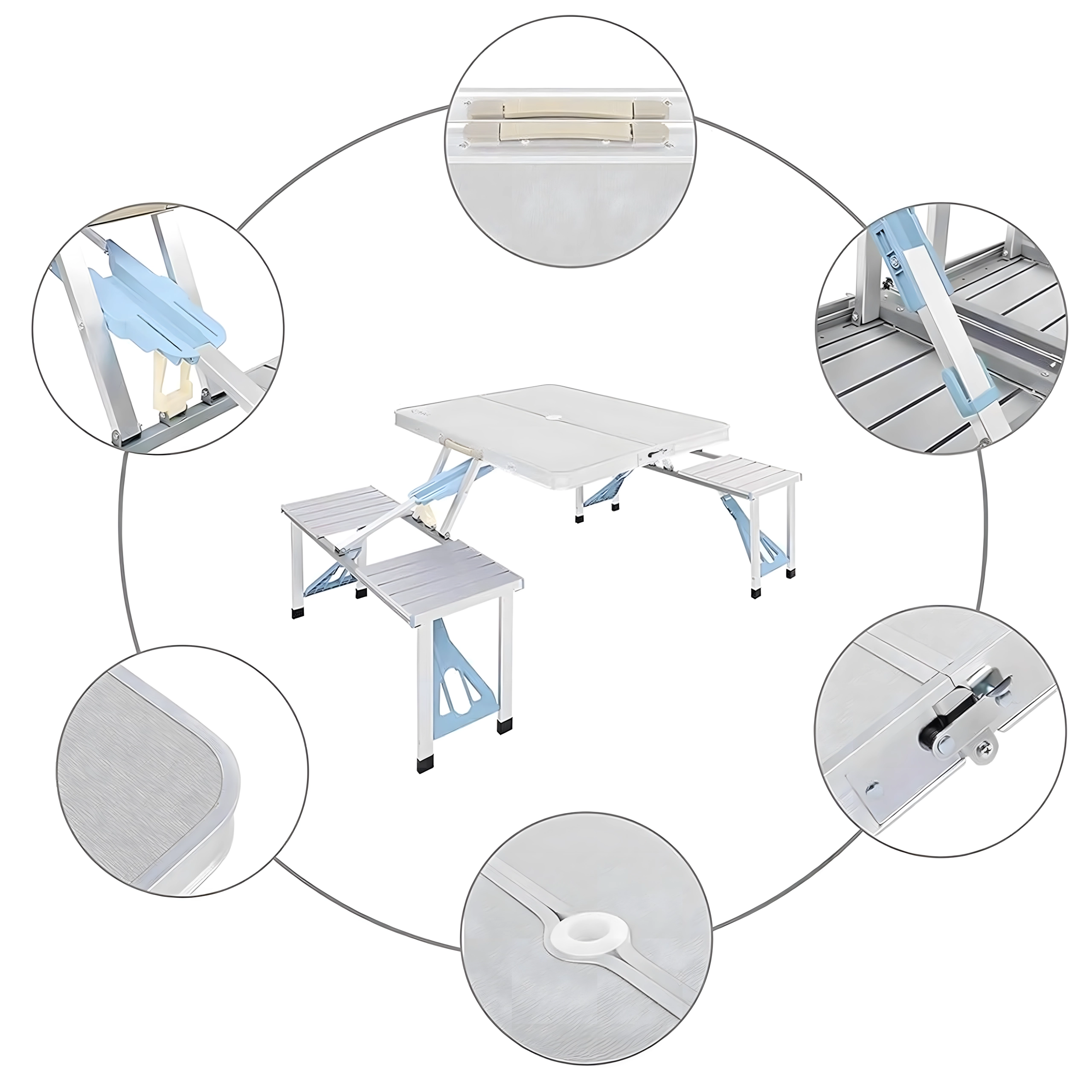 Praktiline ja kerge kokkupandav matkalaud nelja integreeritud istmega on ideaalne piknikule, matkale, randa ja aeda. Vastupidav alumiiniumi ja PVC kombinatsioon tagab pika kasutusea, kokkupanduna muutub komplekt kompaktseks sangaga kohvriks. Laual on päikesevarju ava, et nautida meeldivat varju ka palavatel päevadel.