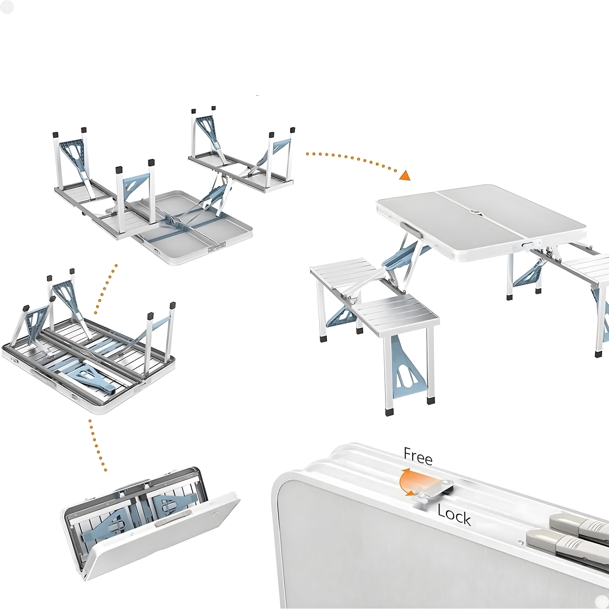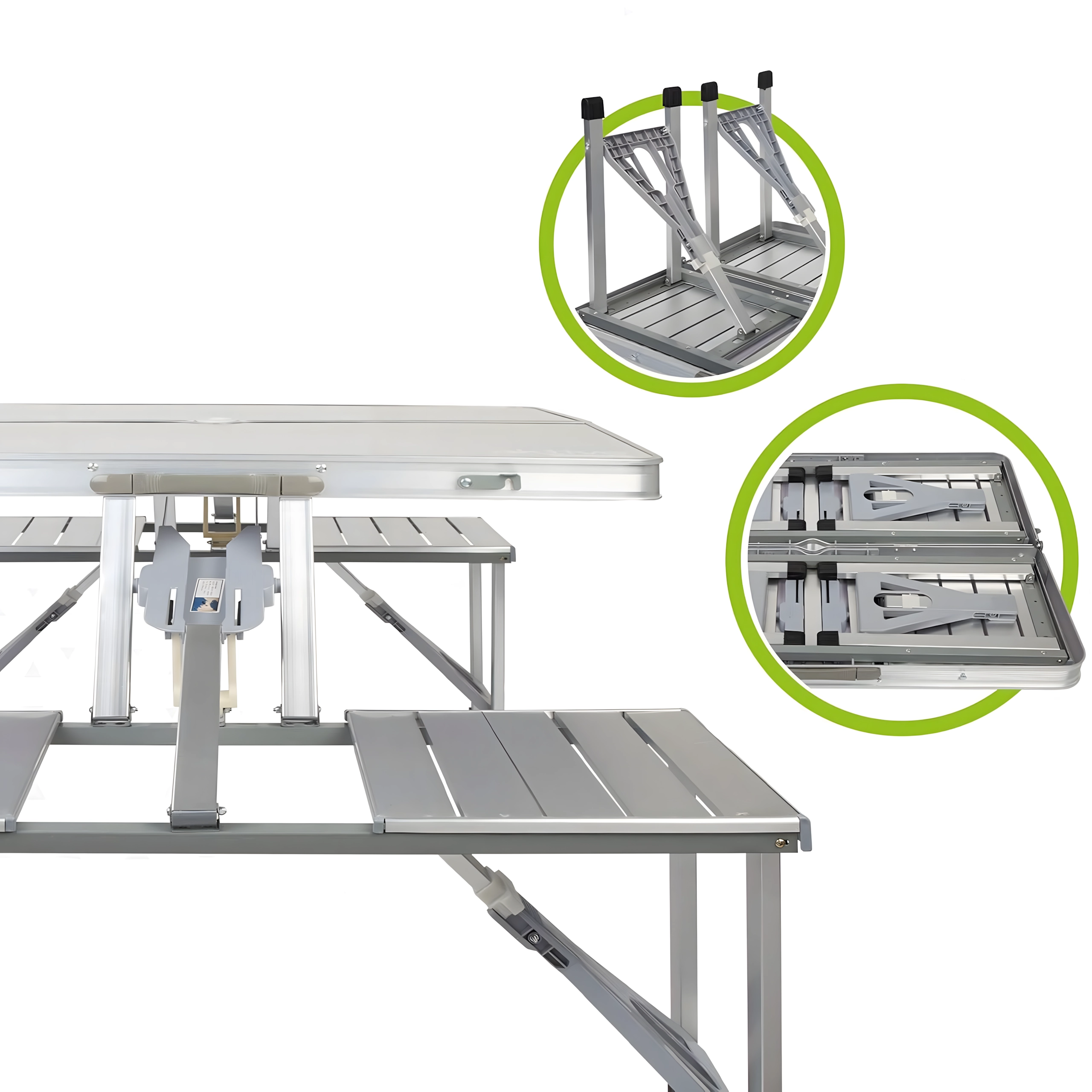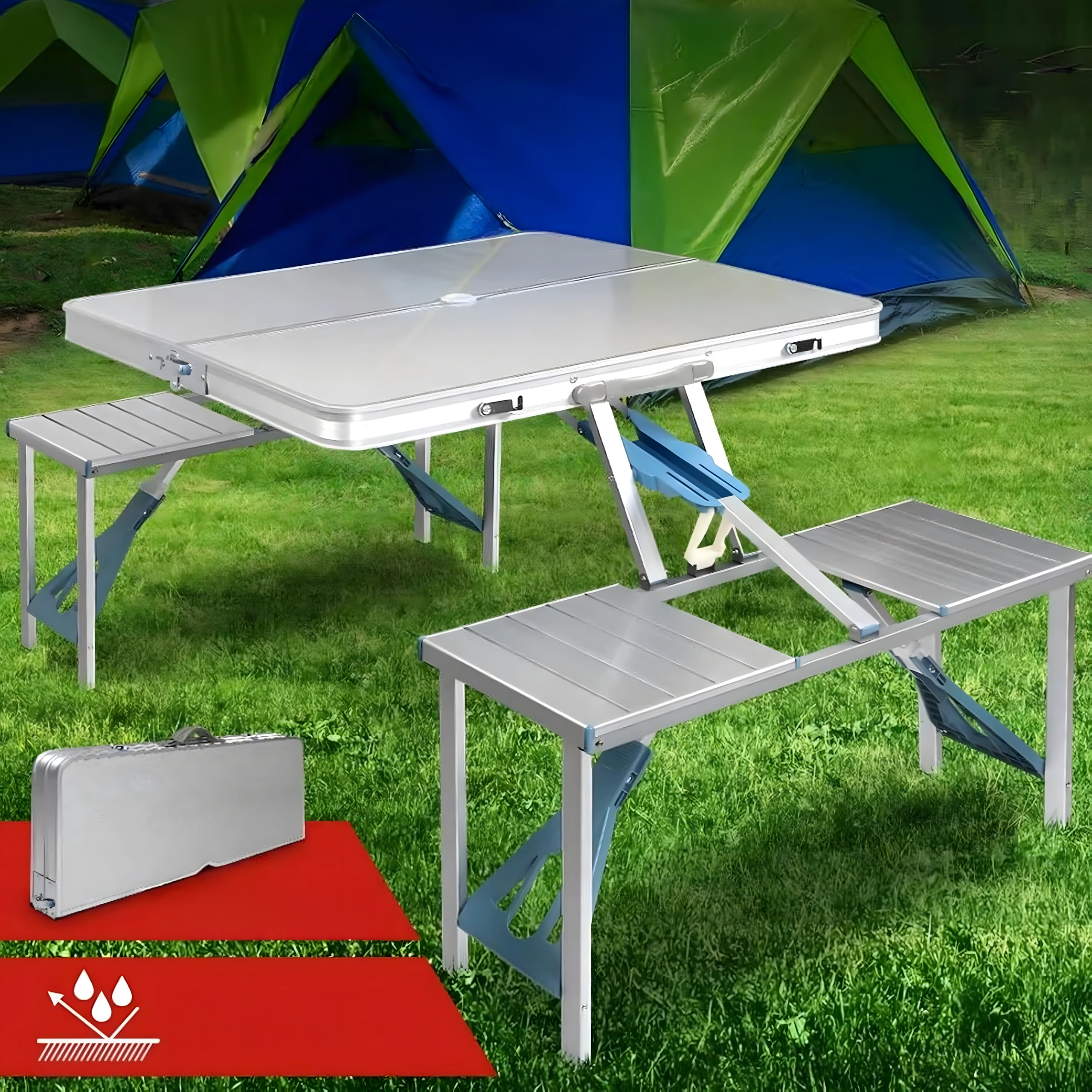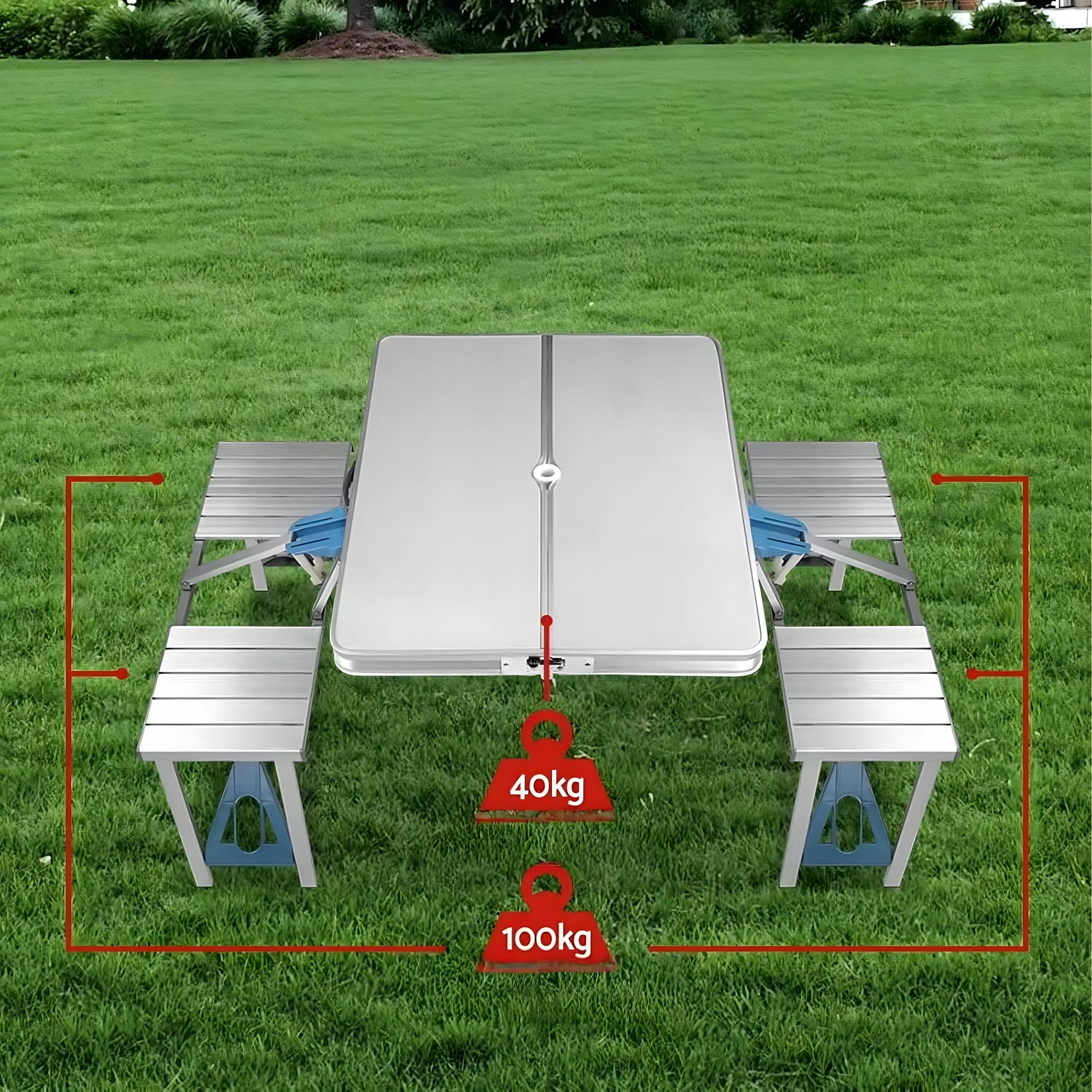 Laua koos nelja integreeritud istmega avad minutiga – ideaalne piknikule, laagrisse ja aeda. Kompaktne lahendus säästab nii ruumi kui aega.