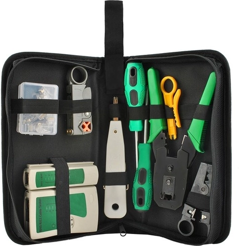 - RJ45/RJ11 kaablitester, 4/6/8P krimpimistangid, löök-/punch-down tööriist, 10× RJ45 pistik karbis, kaablistripper(id), lapikkruvikeeraja, ristpeakruvikeeraja, 2× lõikamis-/isolatsiooni eemaldamise tööriist