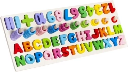 Eemaldatavad puidust tähe- ja numbritükid koos vastavate pesadega tahvlil lihtsustavad kujude äratundmist, nimetamise harjutamist ning esimesi sõnade kokkupanekuid ja lihtsat arvutamist.