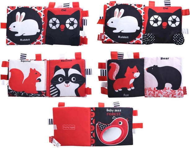 Valmistage oma laps ette võluvaks avastusretkeks kujundite ja mustrite maailma selle imelise raamatuga. Raamat on kujundatud kontrastsetes värvides, nagu must, valge ja punane, mis on imikute nägemisstimulatsiooniks ideaalsed. Raamatus on neli tekstiilset lehte loomakestega, nagu linnuke, jänkuke, öökull, rebane, karu, orav ja pesukaru.