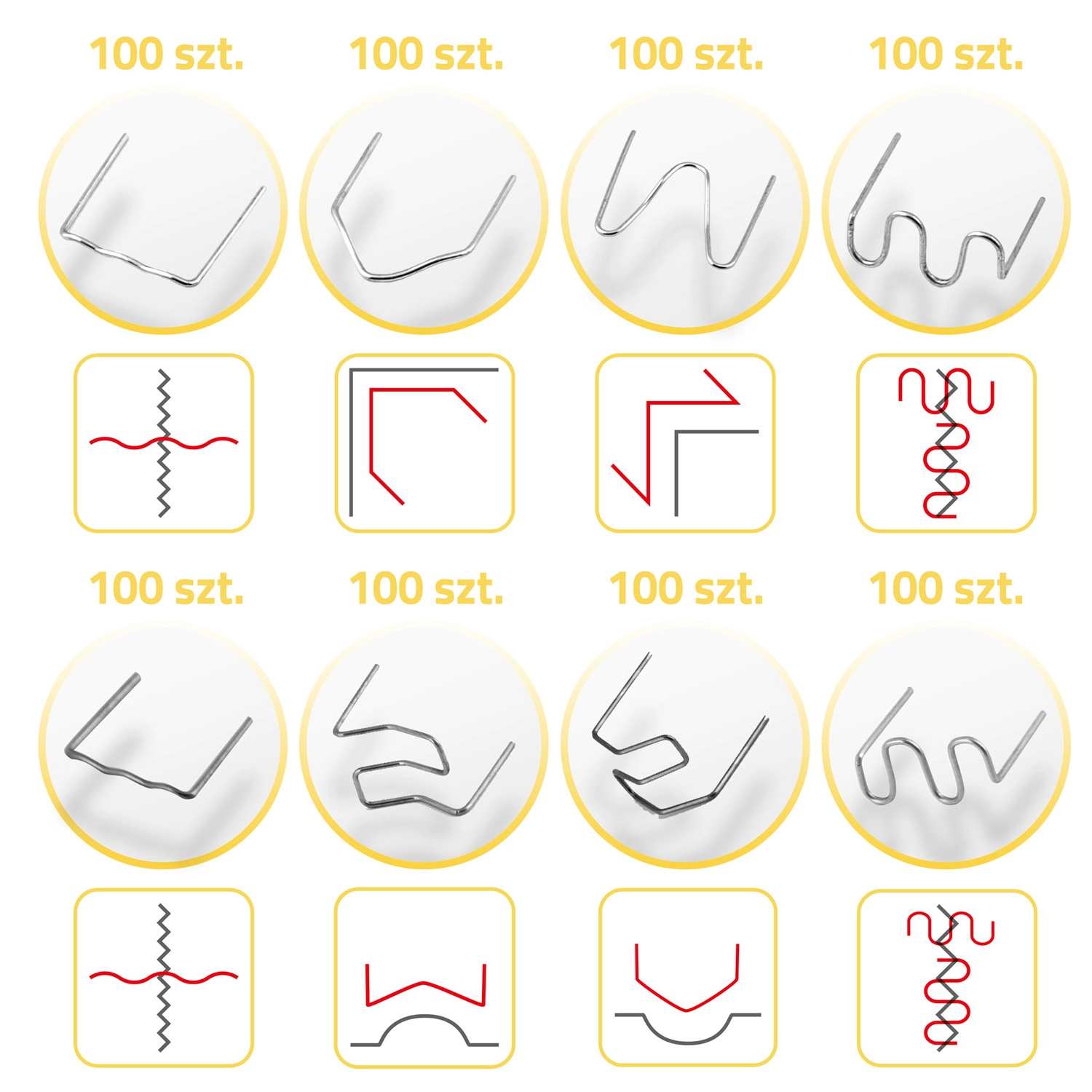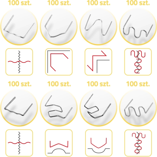 Selle klambrikomplektiga parandad pragunenud kaitserauad, esilaternate katted, salongidetailid ja kodumasinate plastkatted. Erinevad klambrite kujud ja suurused võimaldavad pragude kindlat fikseerimist nurkades, kaartel ja tasapindadel nii õhemates kui paksemates materjalides. Tänu vastupidavale terasele on klambrid stabiilsed, kauakestvad ja roostevabad.