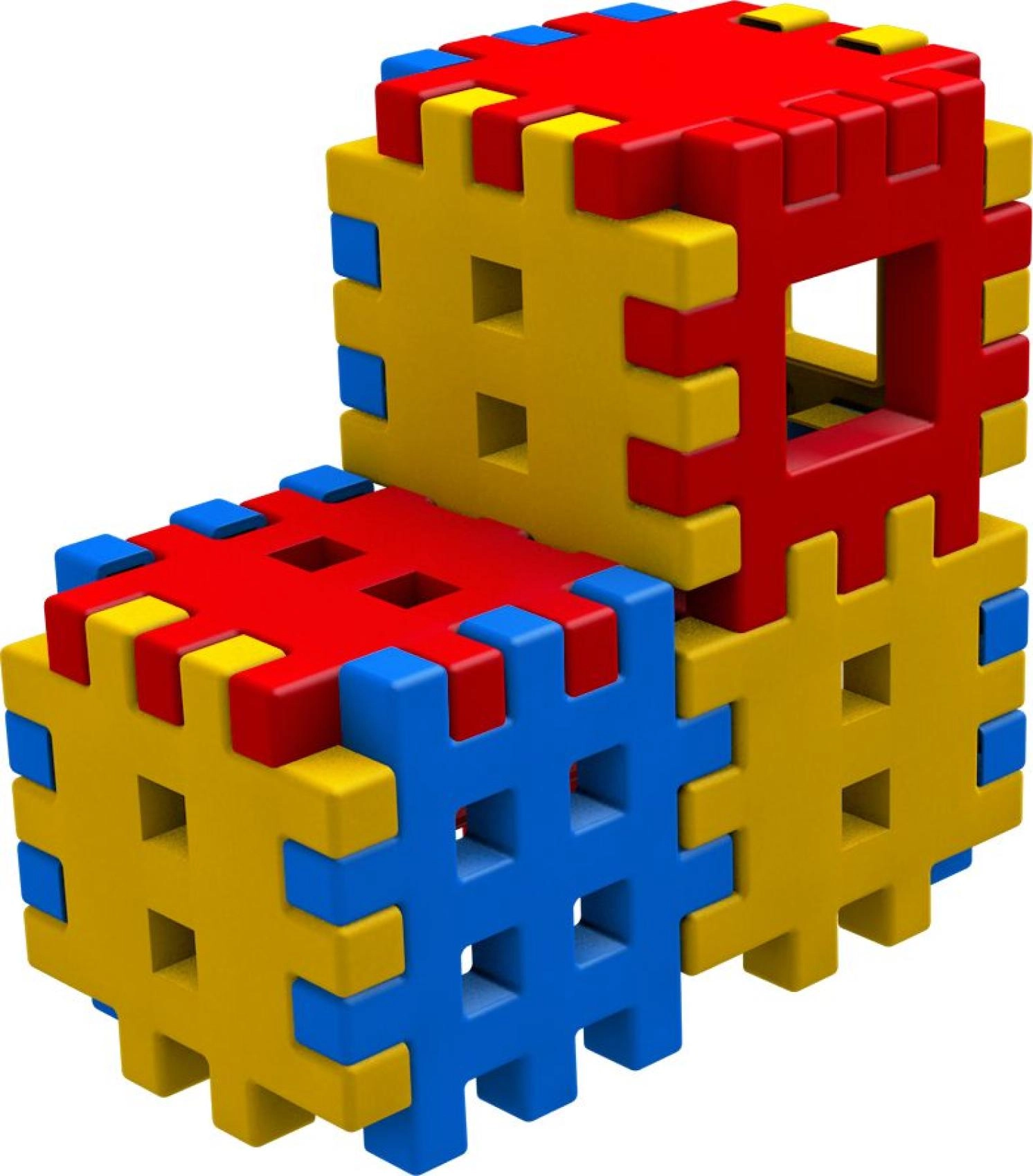 Sakilised servad ja võrelised pinnad võimaldavad kindlat ühendust ning lihtsate 3D-kujude, klotside ja tornide ehitamist.