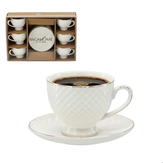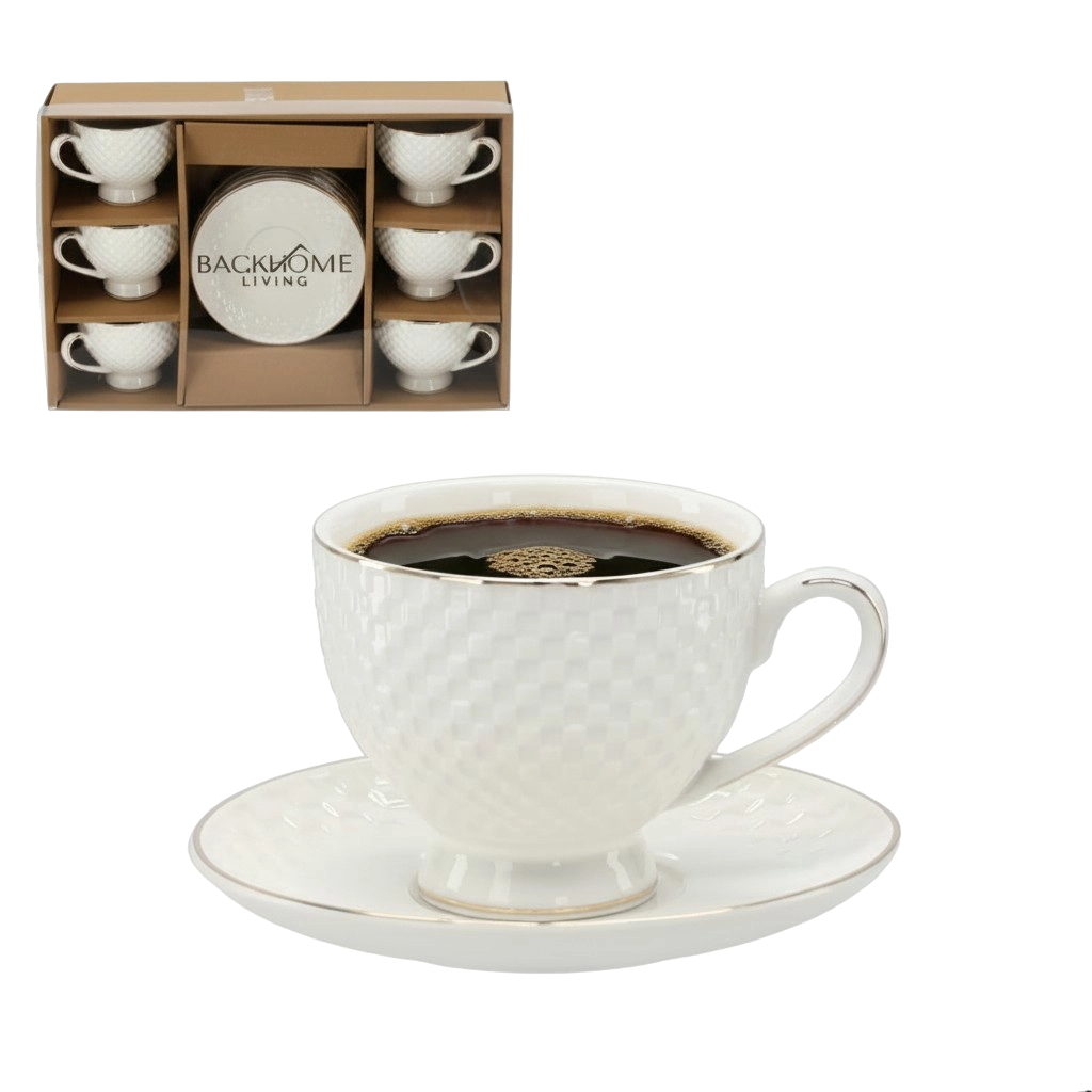 Elegantne kuue reljeefse tassi ja alustassi komplekt mahuga 250 ml, kaunistatud peene kuldse dekoratiivse triibuga. Diskreetne reljeef ja ajatu disain annavad teeninduskomplektile erilise ilme – ideaalne nii igapäevaseks kasutamiseks kui ka pidulikeks puhkudeks.