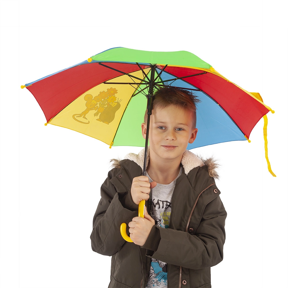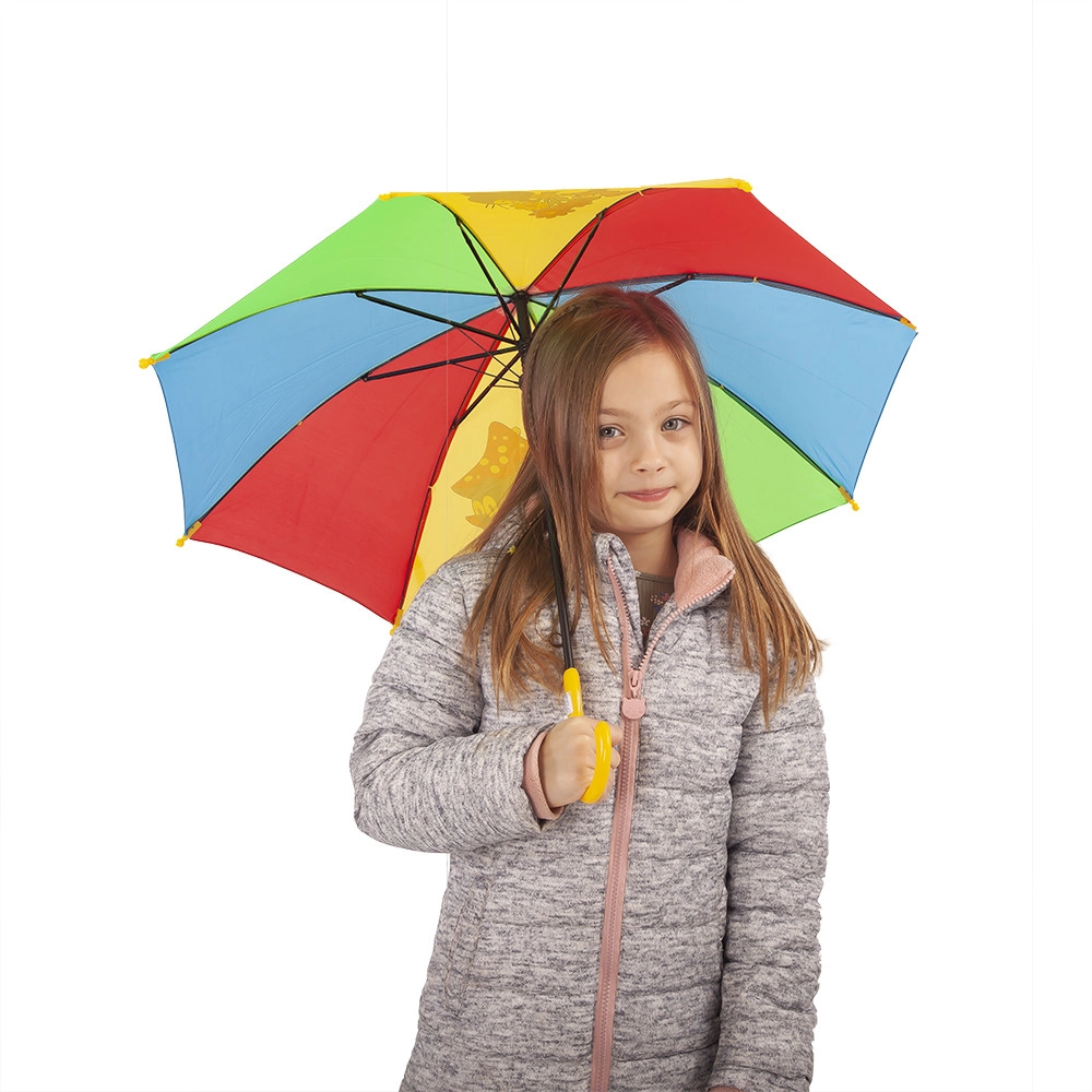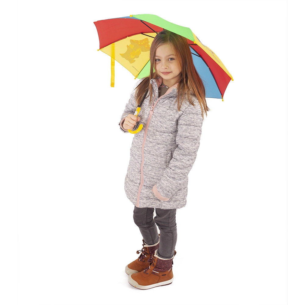 Enam pole kiirustamist enne hoovihma – MUTI motiiviga laste vihmavari on praktiline, kerge ja igapäevaseks kandmiseks ohutu. Värvilised paneelid lõbusate illustratsioonidega püüavad pilku ja kollane kaardus käepide sobib väikestele kätele.