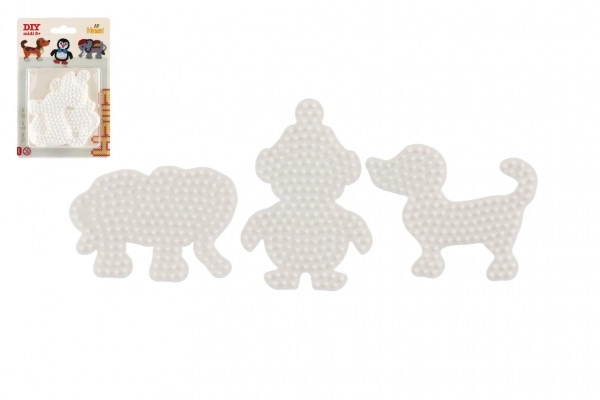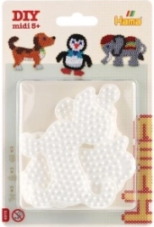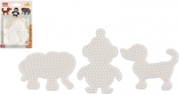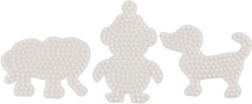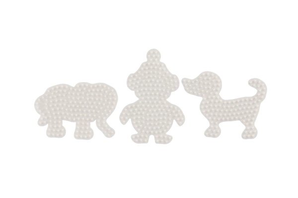 Hama triikhelmete aluste komplekt võimaldab lastel alates 5. eluaastast luua värvilisi pilte tänu valgetele plastalustele elevandi, pingviini ja kutsika kujul.