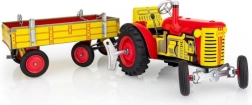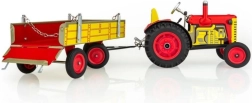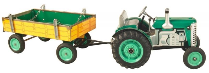Klassikaline plekkmänguasi väikestele ja suurtele põllumajandustehnika fännidele: Zetor traktor lahtivõetava kallurhaagisega vedrumehhanismiga võtmele. Pakub 3 käiku (edasi, neutraal, tagurpidikäik), toimivat roolijuhtimist ja käsipidurit. Täpne Tšehhi meistritöö, „Ohutu mänguasi” sertifikaat ja vastupidav trükitud plekist konstruktsioon plastikkummidega ratastega.