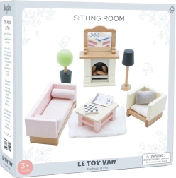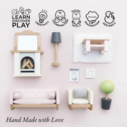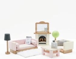 Komplektis on 19 osa: diivan ja tugitool kangast patjadega, diivanilaud, kamin palkide ja peegliga, vaip, lill potis ja lamp. Suurus sobib Le Toy Vani nukumajadele. Daisylane sarja lisatarvikud on saadaval meie veebilehel.