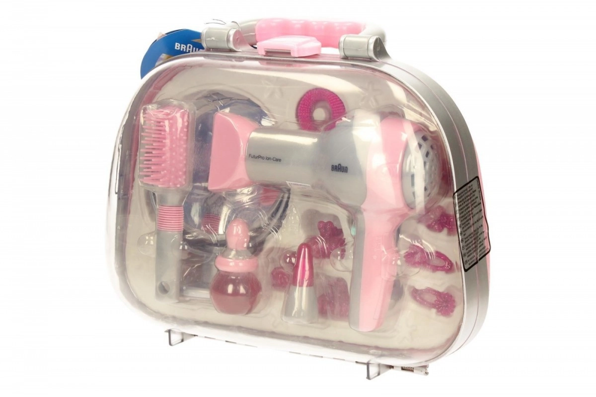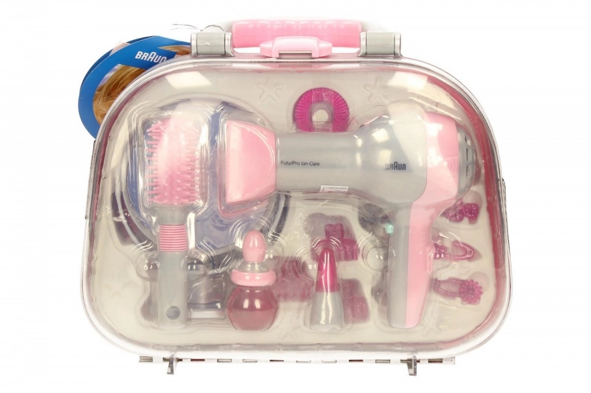 Tee oma lapsele rõõmu Brauni juuksurikomplektiga, mis sisaldab elegantse kohvri sees peeglit, fööni, harja, kammi ja muud olulist tarvikut.