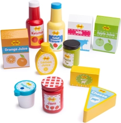 See läbimõeldud puidust komplekt sisaldab valikut populaarseid „kuivaineid“ – näiteks ketšupit, kastet, piima, õuna-, apelsini- ja sidrunimahla, moosi, võid, pestot, juustu ja jogurtit. Tõetruud vormid ja värvilised etiketid kutsuvad mängima ning õpetavad märkamatult toiduaineid tundma ja rääkima tervislikust toitumisest.