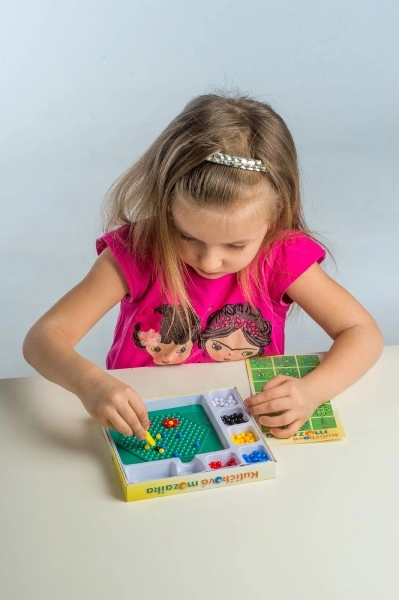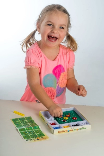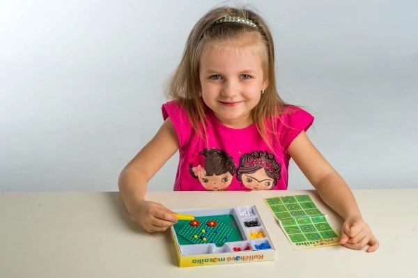 See mosaiik on suurepärane valik esimeseks meisterdamiseks. Lapsed asetavad pintsettide abil värvilised kuulid alusele ja loovad lihtsaid ning leidlikke motiive. Tegevus toetab kannatlikkust, silma–käe koordinatsiooni ja peenmotoorika arengut.