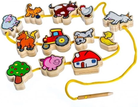 Komplektis on 12 puidust tükki, puidust nõel, puuvillane nöör ja puidust klamber. Lõbusad ja värvikad motiivid on loodud köitma laste tähelepanu ning sobivad suurepäraselt nii õppimiseks kui mänguks.