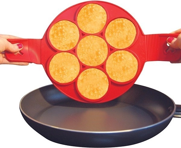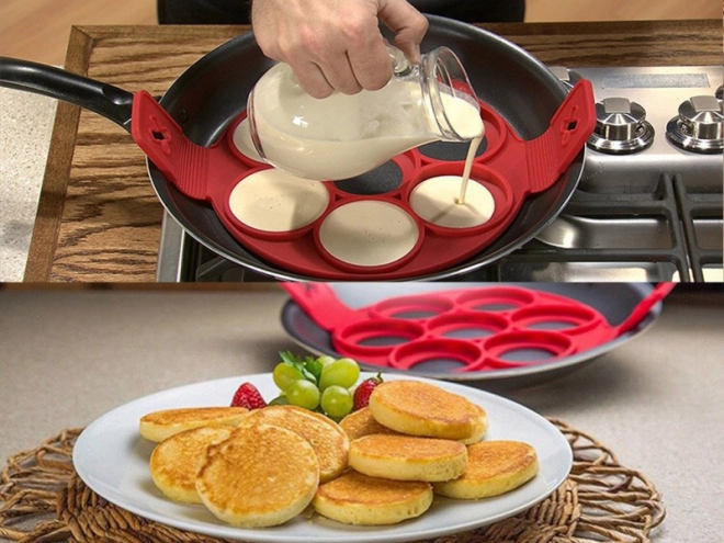 See mitmeotstarbeline toidusilikoonist vorm teeb hommikusöögi ja kiirete õhtusöökide valmistamise lihtsaks. Asetage see lihtsalt pannile, täitke avad tainaga ja pärast küpsemist keerake külgkäepidemetest – tulemuseks on ühtlaselt küpsenud ja täiusliku kujuga pannkoogid ilma taina laialivalgumiseta.