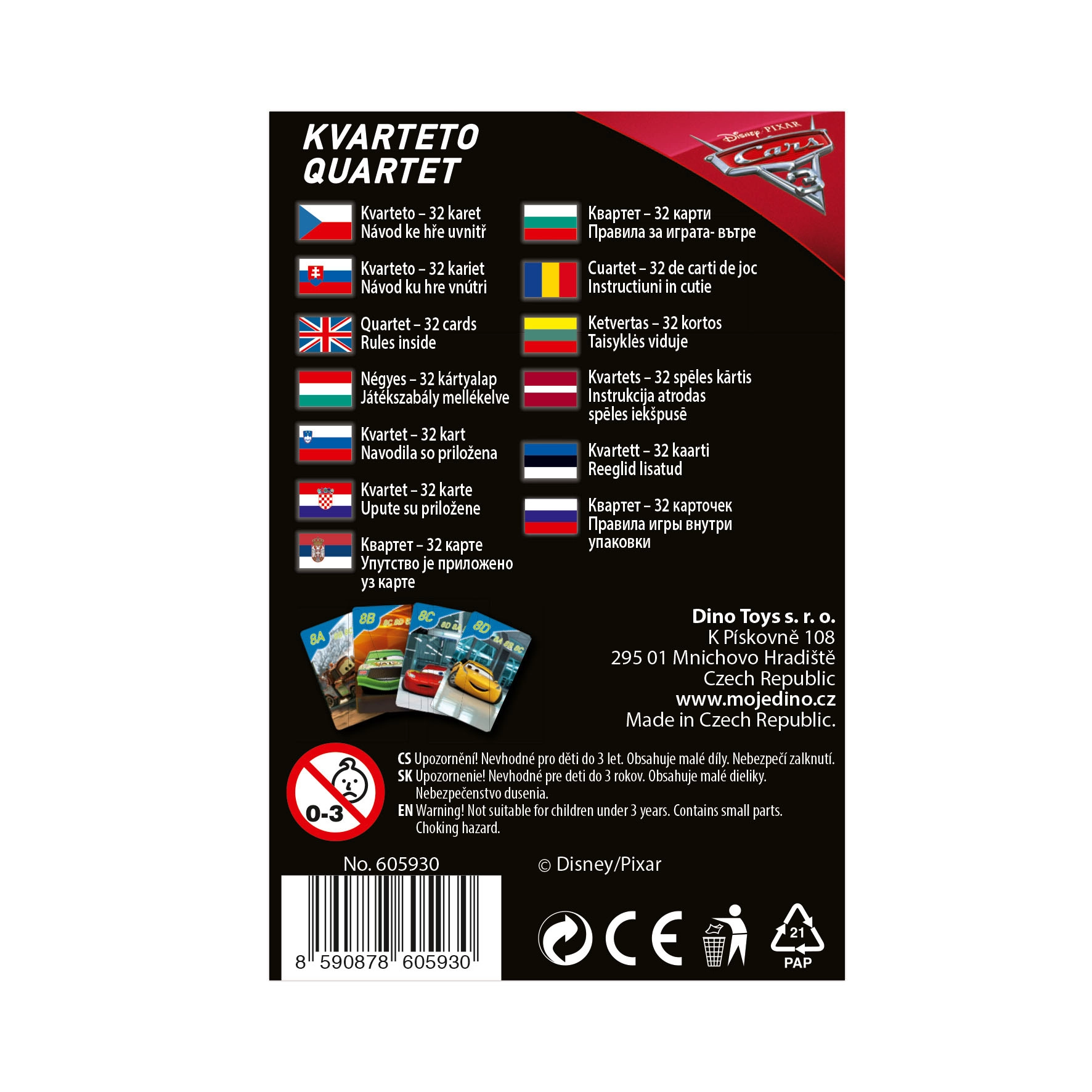 Astu autode maailma Cars 3 Quarteto mängukaartidega, kus võistlevad Välk McQueen, Pukseerija (Mater) ja Cruz Ramirez. See kaardimäng sobib ideaalselt 3–6 lapsele, kes soovivad ühiselt lõbutseda. Mängu eesmärk on koguda võimalikult palju nelikuid sama sümboliga kaartidest.
