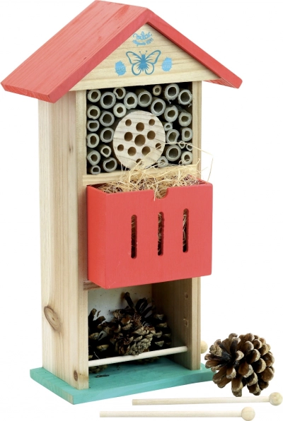 Tänu dekoratiivsetele punastele katustele ja looduslähedasele välimusele on see putukahotell iga aia esteetiline täiendus.