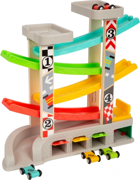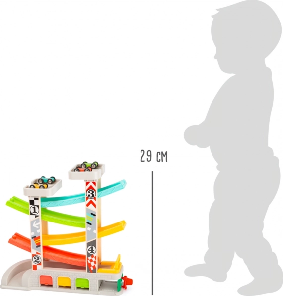 Võidusõidurada sisaldab eri tasandeid ja värvilisi väikeautosid, mis tagab lõbusa ja hariva mängu.