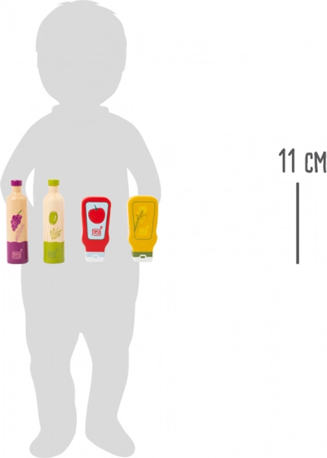 Täienda lapse kööki stiilse nelja puidust pudeli komplektiga – äädikas, õli, ketšup ja sinep. Vastupidav teostus, ohutud servad ja silmapaistvad illustratsioonid aitavad sisu hõlpsasti eristada. Ideaalne rollimängudeks, peenmotoorika ja fantaasia arendamiseks alates 3. eluaastast.