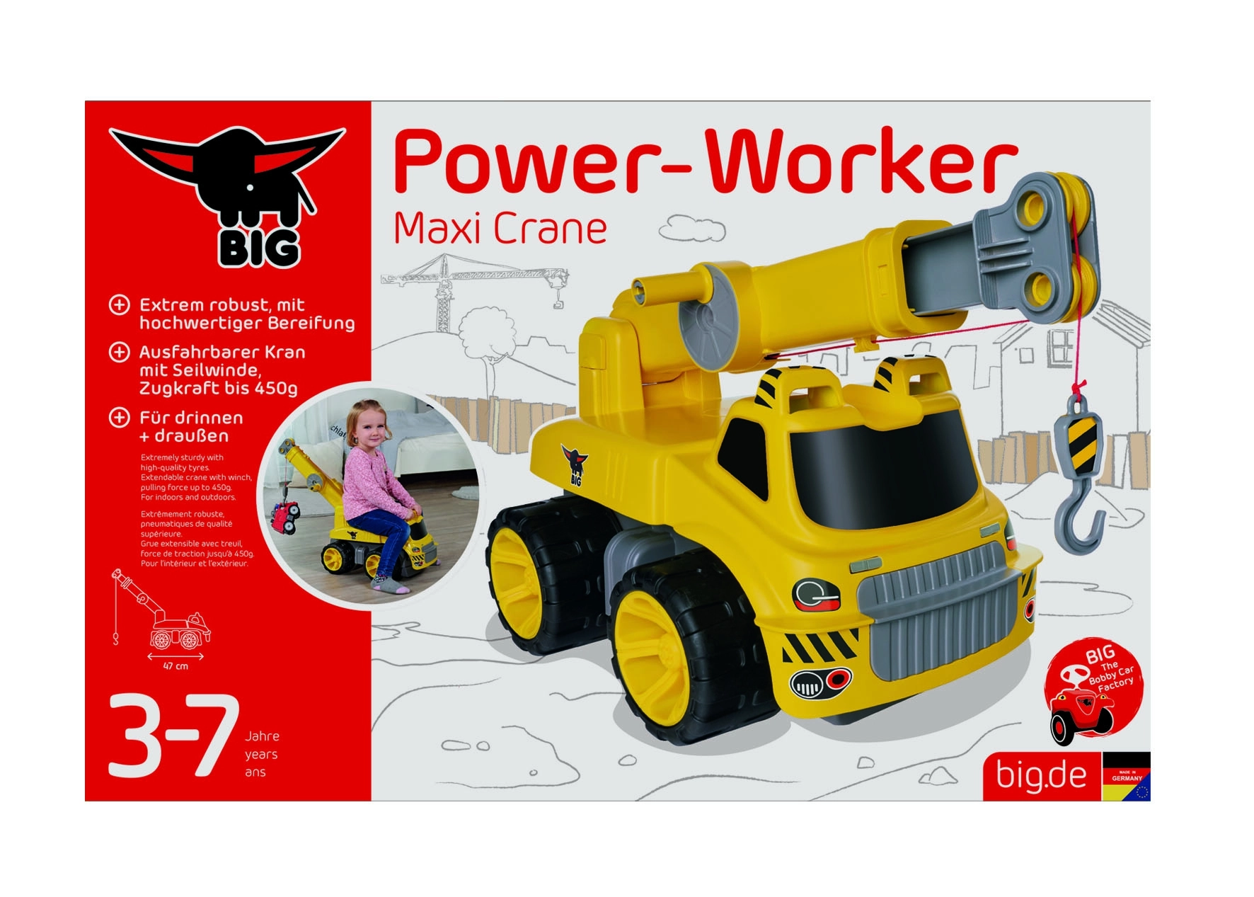 BIG Power Worker maxi kraana on stabiilne lükatav sõiduk kvaliteetsest, vastupidavast plastist, mis on loodud pikaajaliseks kasutamiseks ja turvaliseks mänguks. Kraana torn pöörleb 360° ning liikuvat poomi on lihtne juhtida, nii et lapsed saavad tõsta ja teisaldada esemeid võimsa trossvintsiga, mille tõmbejõud on kuni 450 g.