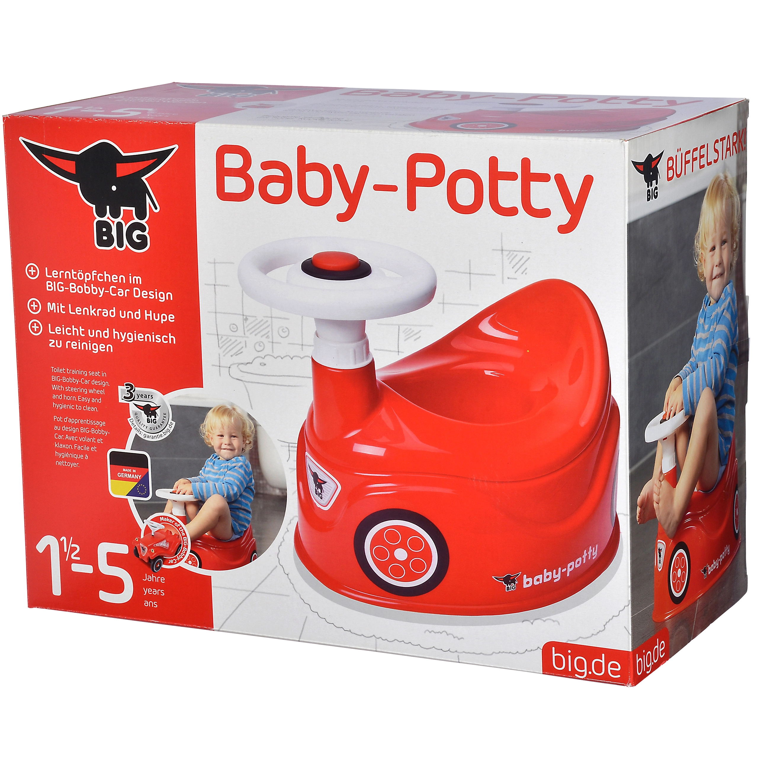 Muuda esimesed potitreeningu sammud lõbusaks! BIG New Bobby Car laste pott näeb välja nagu päris punane väike auto koos rooli ja signaaliga, sellel on kõrge seljatugi, integreeritud pritsmekaitse ja eemaldatav sisupott lihtsaks puhastamiseks. Valmistatud kvaliteetsetest ja ohututest materjalidest, mida on lihtne hooldada.