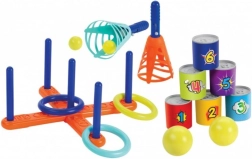 Naudi lõbu koos mängukomplektiga 3 ühes, mis sisaldab kolme populaarset mängu nii siseruumi kui ka õue: palli püüdmine, rõngaste viskamine ristile ja plekkpurkide allalöömine. Valmistatud vastupidavast plastist Prantsusmaal.