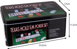 Täielik TEXAS HOLD’EM pokkerikomplekt praktilises metallist karbis, mis sisaldab 200 žetooni eri nominaalidega, 2 kaardipakki, funktsionaalsete žetoonide komplekti (Dealer, Small Blind, Big Blind) ja rohelist mängumatti. Kõik on korrektselt paigutatud žetoonialusele, mis tagab korra ja lihtsa transpordi.