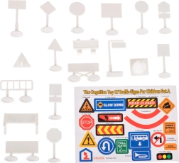 Komplekti kuuluvad liiklusmärgid, mis aitavad lastel lõbusalt omandada teeliikluse põhireegleid.