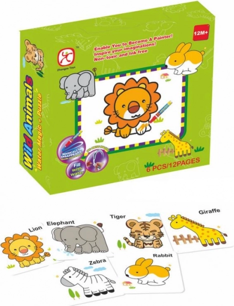 Toppimispusle Loomad ja veemaalimine on ideaalne kombinatsioon kujutlusvõime ja peenmotoorika arendamiseks. Lapsed saavad nautida kuut erinevat pilti – jänes, elevant, kaelkirjak, lõvi, sebra ja tiiger.