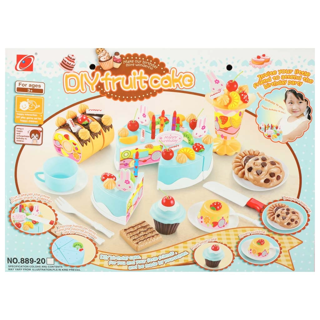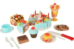 - Komplekti sisu (75 tk): 6× koogitükk, 5× küünal, 14× besee, 7× suhruppulk, 4× kirss, 4× mandariin, 3× maasikas, 3× kiivi, 4× jänes, 1× kiri, 3× taldrik, 3× küpsis, 3× rullbiskviidi viil, 3× tassikook, 1× tass, 1× teelusikas, 1× kahvel, 1× nuga, 1× koogilabidas, 1× jäätisepokaal, kleepsude komplekt, takjapaelade komplekt.