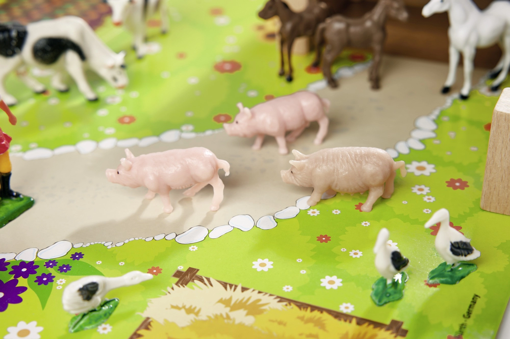 - maja, tall, värviline matt, aedikud/aiad, kleepsud, 12 kujukest (3 põrsast, 2 lehma, 3 hane, 3 hobust, talunik)