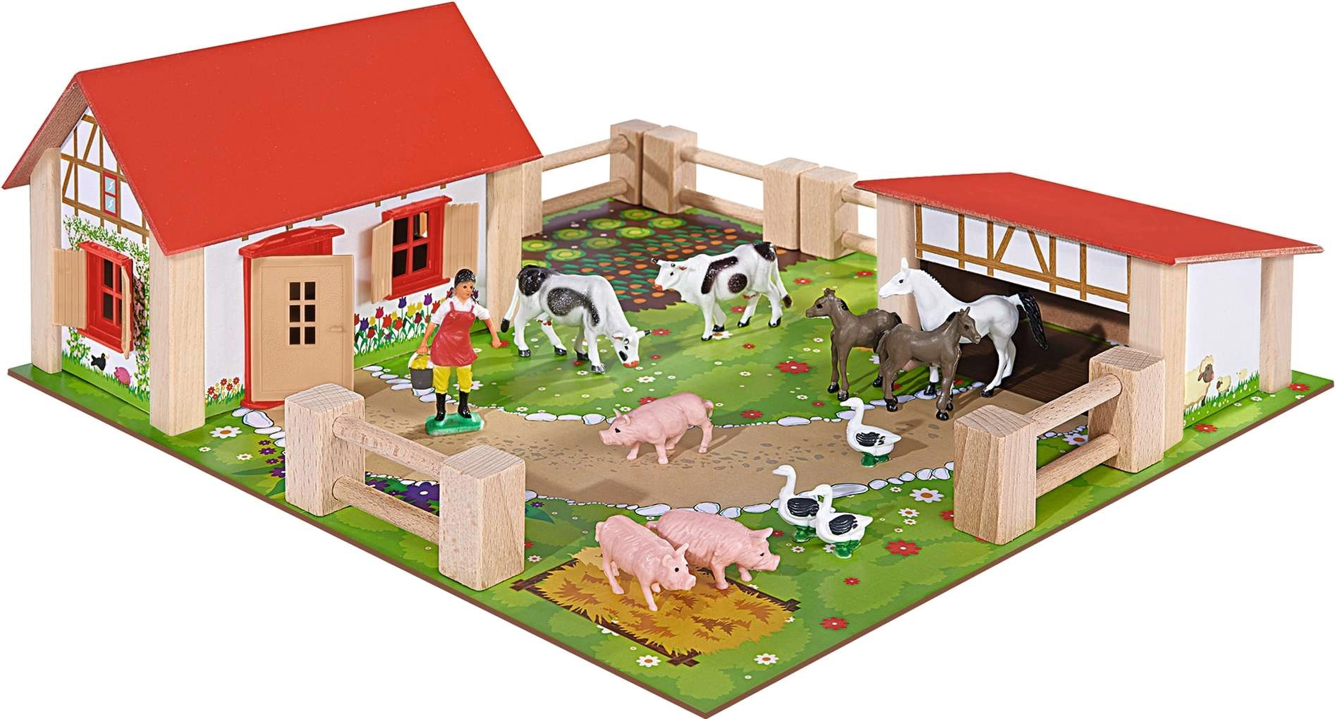 EICHHORNi puidust talu rõõmustab iga väikest talunikku. Komplekt sisaldab punase katusega maja, talli, aedu ning detailseid loomakujukesi, sh hobuseid, lehmi, põrsaid ja hanesid. Kaasas on ka värviline matt teede ja aiamaaga, mis juhendab lapsi oma stseenide ja lugude loomisel. Tugev puitehitus ja vastupidavad materjalid tagavad pika kasutuse ja turvalise mängu.