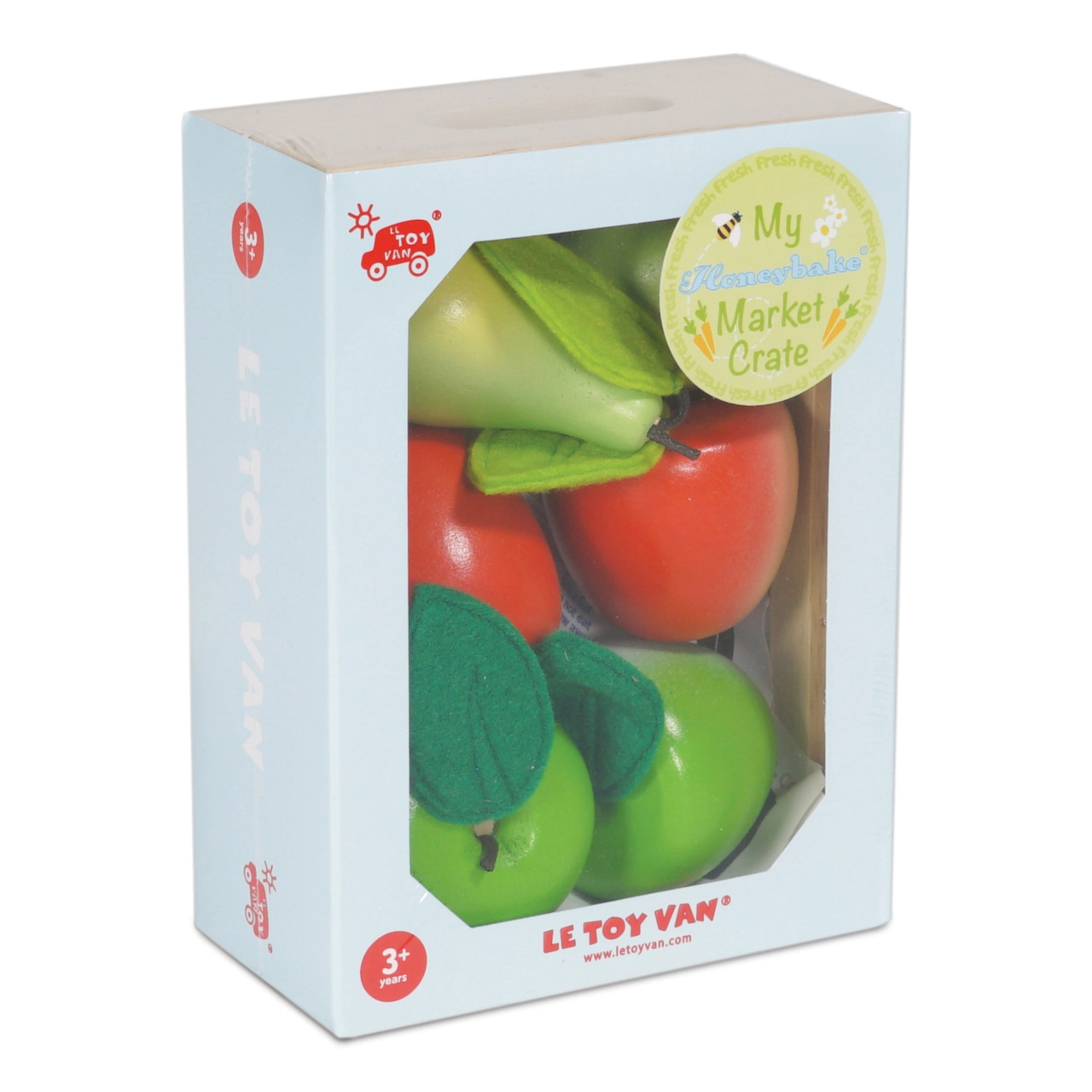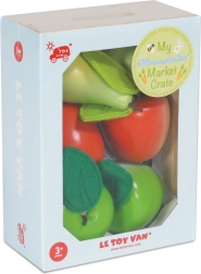 Naudi päeva „turul” selle kauni LE TOY VAN puidust kastiga, mis on täis puuvilju. Komplektis on kaks punast ja kaks rohelist õuna ning kaks rohelist pirni vildist lehtedega. Mänguasi on valmistatud jätkusuutlikust puidust, värvitud mittetoksiliste veepõhiste värvidega ning sobib suurepäraselt väikestesse kätesse. Soodustab kujutlusmängu, peenmotoorikat ja tervisliku toitumise tundmaõppimist.