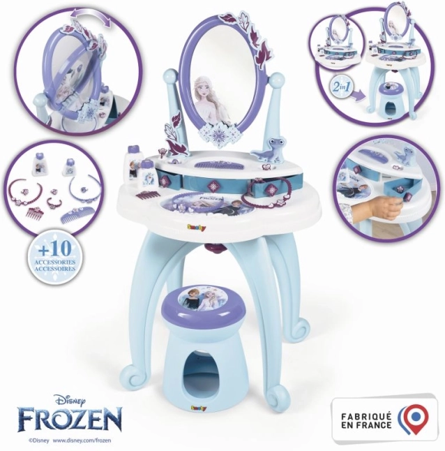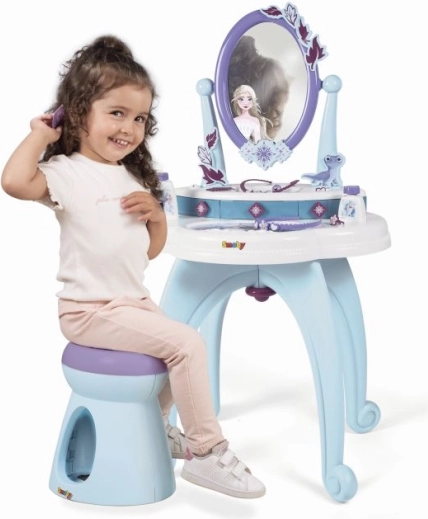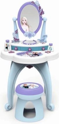 2-ühes tualettlaud, mis on inspireeritud Lumekuningriigist, pakub kõike, mida väikesed printsessid oma igapäevaseks hoolduseks vajavad. Komplektis on suur pöörlev peegel ja rikkalik lisavarustus, nagu parfüümid ja muud kosmeetilised tarvikud.