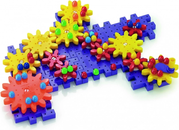 Värviliste hammasrataste ja kujukeste komplekt võimaldab lastel luua erinevaid struktuure, õppides samal ajal lõbusalt mehaanika aluseid.