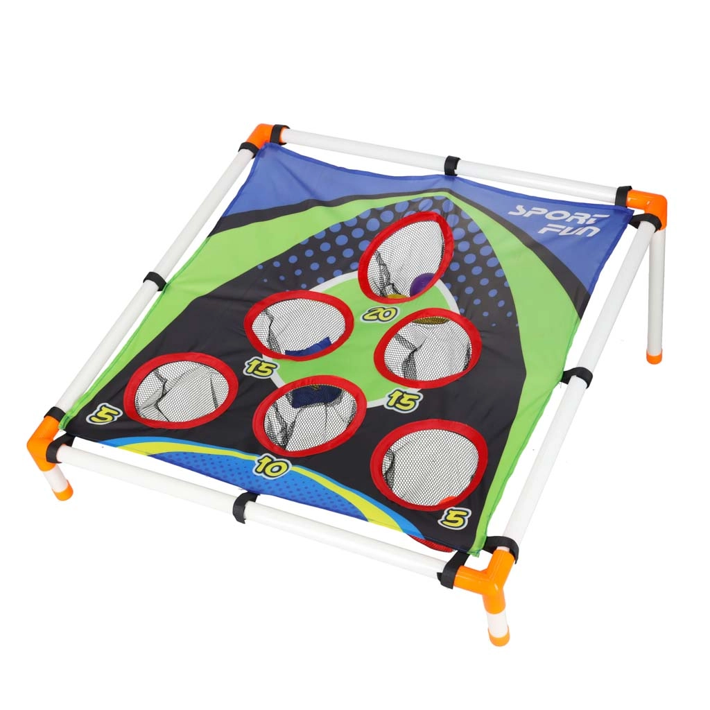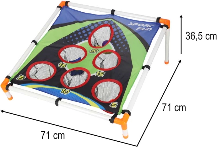 Kerge plasttorudest konstruktsioon kallutatud alusega tagab stabiilsuse, vastupidav tekstiilpind viie kuni kuue punktiga tähistatud avaga püüab kotikesed ja pallid kinni võrkkottidesse. Kokku panemine on intuitiivne ja kogu mänguväljakut on lihtne kõikjale kaasa võtta.
