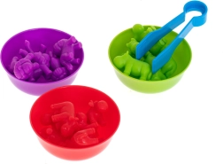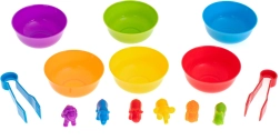 Kuus eri värvi kaussi ja 36 figuuri võimaldavad lastel sorteerida, liita ja võrrelda – ideaalne esimeste matemaatikaülesannete jaoks.