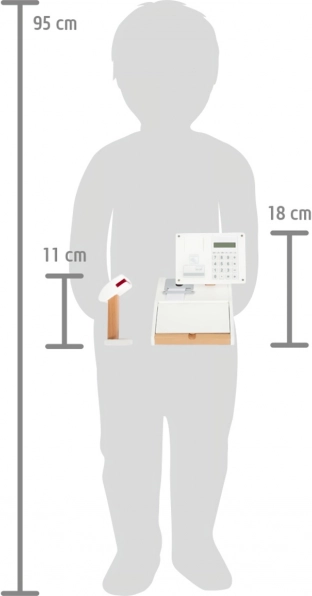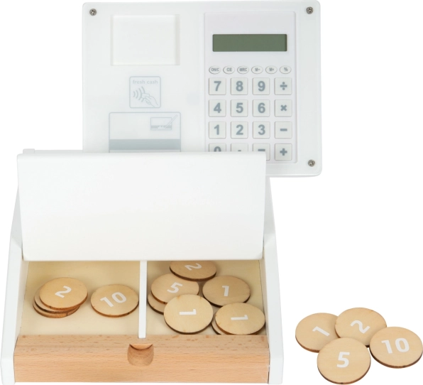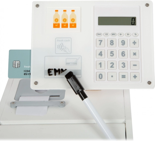 Puidust kassaaparaat SMALL FOOT Fresh muudab iga mängunurga pisikeseks supermarketiks. Tänu integreeritud kalkulaatorile pööratavas ekraanis saavad lapsed ostu hõlpsalt kokku arvutada, avada suure sahtli müntide lahtritega ja proovida sularahata makset oma kaardi ning allkirjaga pleksiklaasil.