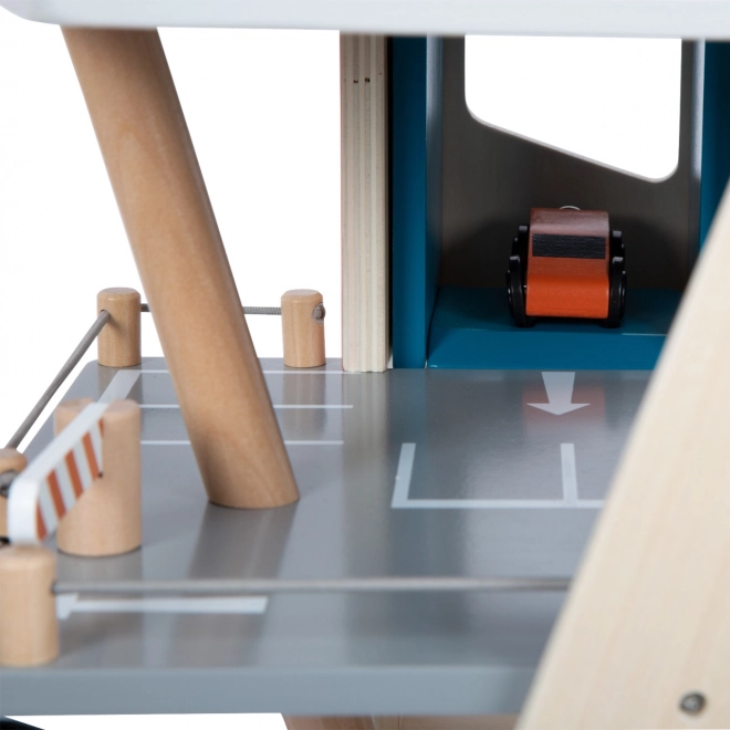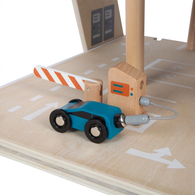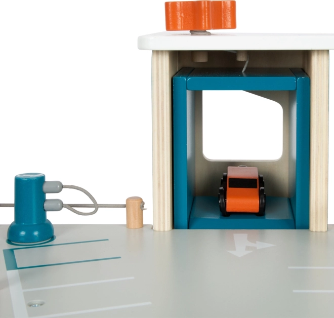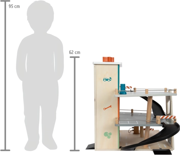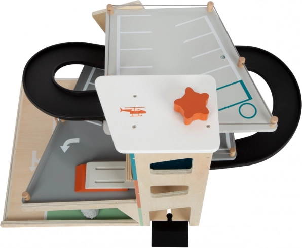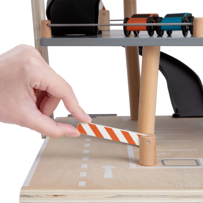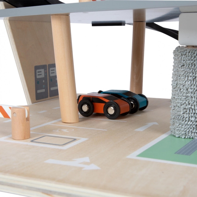 See stiilne puidust võidusõidu parkla toob laste jaoks rikkalikult varustatud mängumaailma. Kolm korrust on ühendatud toimiva lifti ja kahe sujuva kaldteega, mis võimaldavad autodel sujuvalt liikuda. Igal tasandil on mehaaniline tõkkepuu ja kummist servapiirded, mis lisavad dünaamikat ja takistavad sõidukite mahalibisemist. Värvilised ikoonid ja liiklusmärgid toetavad õppimist läbi mängu ning arendavad kujutlusvõimet.