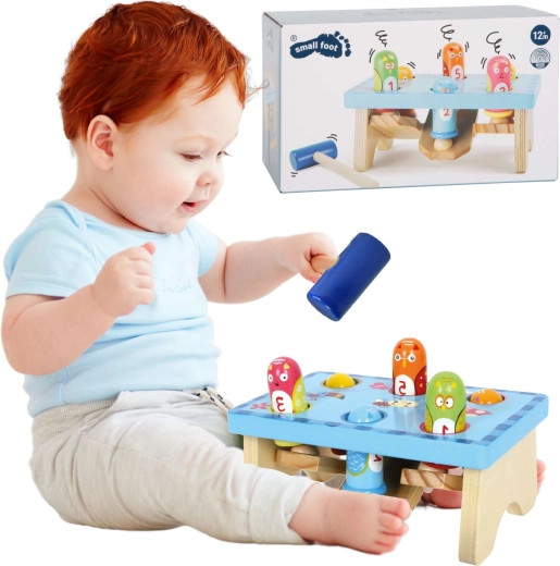 Lõbus Small Footi puidust toksimispink lindude motiividega arendab laste motoorikat ja keskendumisvõimet. Komplekti kuuluvad stabiilne helesinine pink, värvilised pulgad ja puidust haamer. Mänguasi toetab käe-silma koordineerimist, löögitäpsust ja värvide ning numbrite õppimist, on valmistatud kvaliteetsest puidust ning sobib lastele alates 18. elukuust.