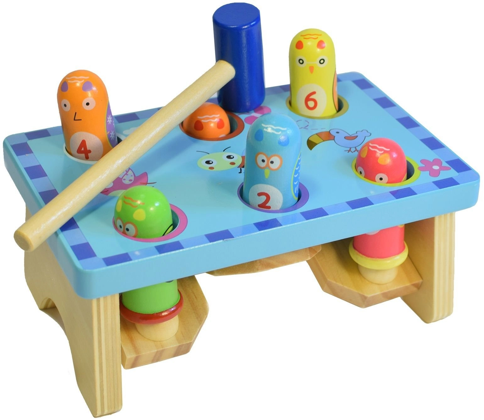 Tänu tugevatele materjalidele ja ergonoomilisele haamrile harjutavad lapsed peenmotoorikat, liigutuste koordineerimist ja kannatlikkust. Värvilised ja nummerdatud pulgad aitavad värvide eristamisel ja loendamisel, nii et mäng seostub loomulikult õppimisega.