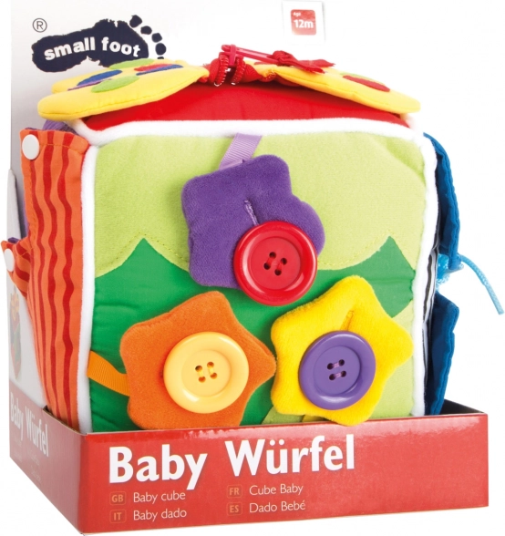 Plüüsist tegevuskuup Small Footilt on ideaalne mänguasi laste peenmotoorika arendamiseks. See sisaldab erinevat tüüpi kinnitusi, nagu nupud, lukud ja nöörid, mis toetavad taktiilset avastamist.