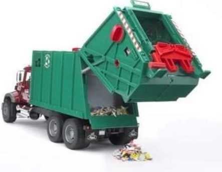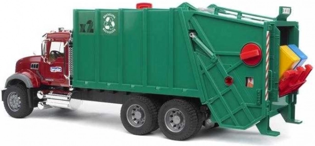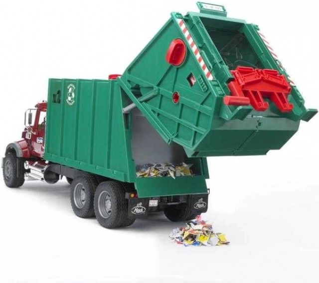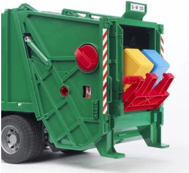 Täielikult toimiv tõstuk tühjendab prügikastid kogumissahtlisse, kus prügipress lükkab materjali veoki tagaossa. Täitumisel saab tagaluugi avada ja lasti välja kallata. Kõike täiendavad avatavad kabiiniuksed, tõstetav kapott vaatega mootorile ja kokkuklapitavad küljepeeglid. Mudel on valmistatud Saksamaal kvaliteetsest plastist ja peab vastu ka intensiivsele laste mängule.