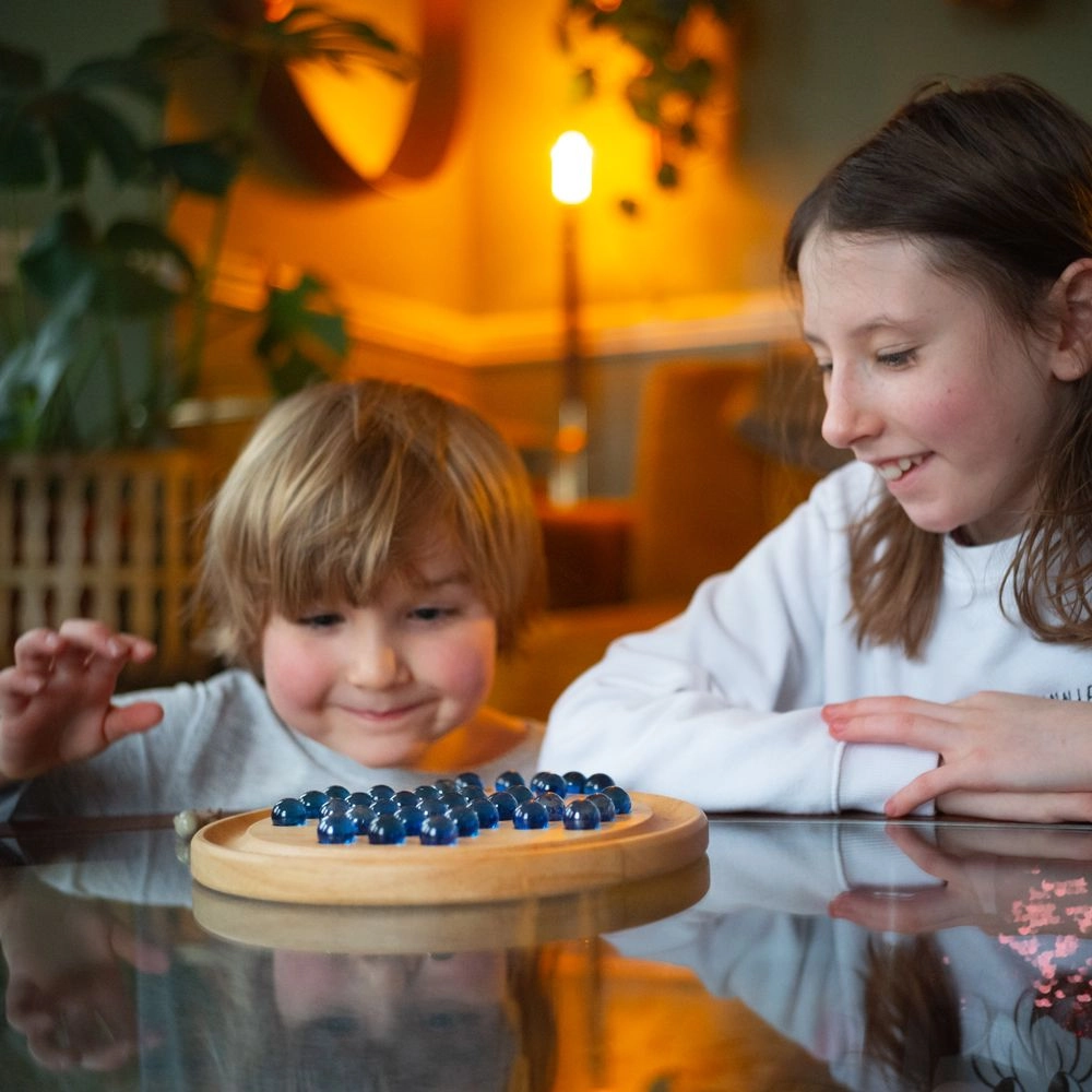 Sile puidust ümmargune alus ja läikivad klaaskuulid tagavad mõnusa mängutunde ja pika vastupidavuse.