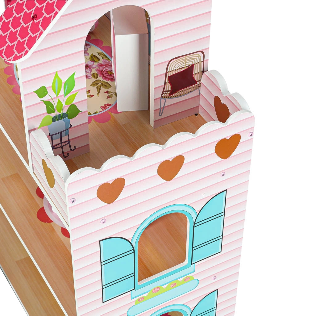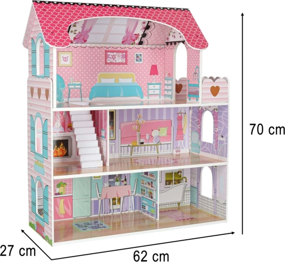 Suur puidust nukumaja rõõmustab nii lapsi kui ka vanemaid. Kolm avarat korrust peidavad endas kööki, vannituba, magamistuba, elutuba ja treppi rõduga. Rikas puidust lisade komplekt ja realistlikud seinatrükised toetavad loovat rollimängu ja peenmotoorika arengut.