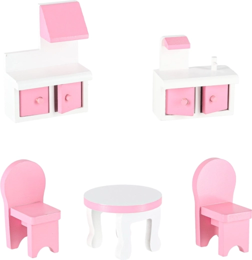 Komplektis on kapid avanevate ustega, köögimööbel, laud ja toolid, häll, lamp ning tualett – kõik siledalt viimistletud puidust peente detailidega.