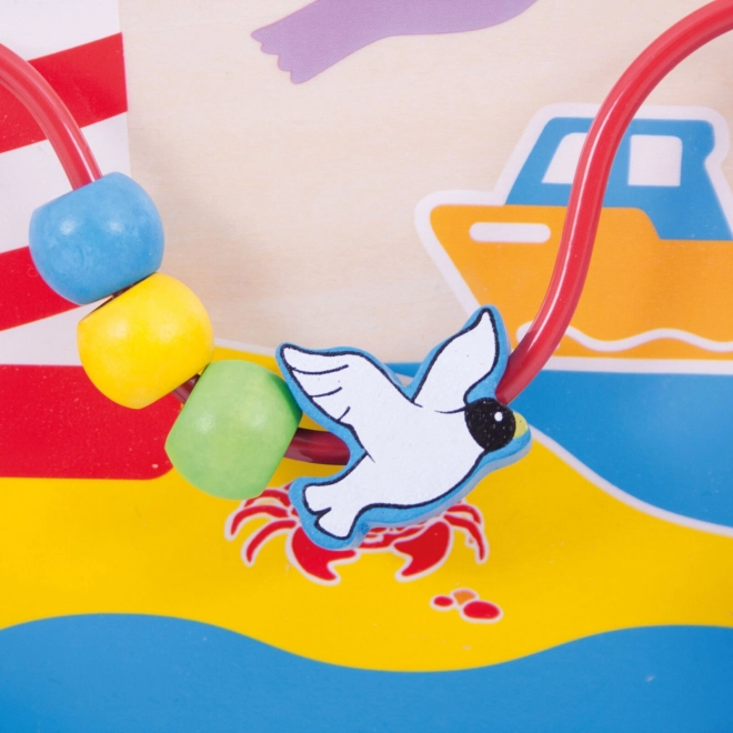 See mereteemaline puidust tegevustahvel pakub lastele rohkelt tegevusi: pöörlev labürint, keerlevad merihobud, liuglevad kalakesed ja helmestega traat koos kajakatega. Iga element on loodud toetama oskuste loomulikku arengut, kannatlikkust ja keskendumist. Tänu reguleeritavatele kinnitustele saab tahvli turvaliselt ka voodi külge kinnitada, pakkudes beebile stimuleerivat mänguaega käeulatuses.