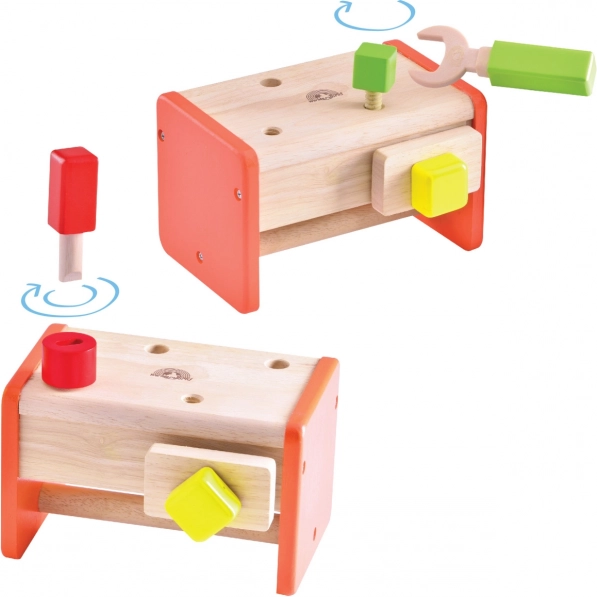 Komplekt on valmistatud vastupidavast täispuidust ja puitplastist, mis tagab pika kasutusea ja ohutuse mängimisel. Loodusliku ilme ja erksate värvide atraktiivne kooslus köidab iga lapse tähelepanu. Lapsed õpivad tööriistu eesmärgi järgi sorteerima ning kompaktne ehitus aitab säästa ruumi.